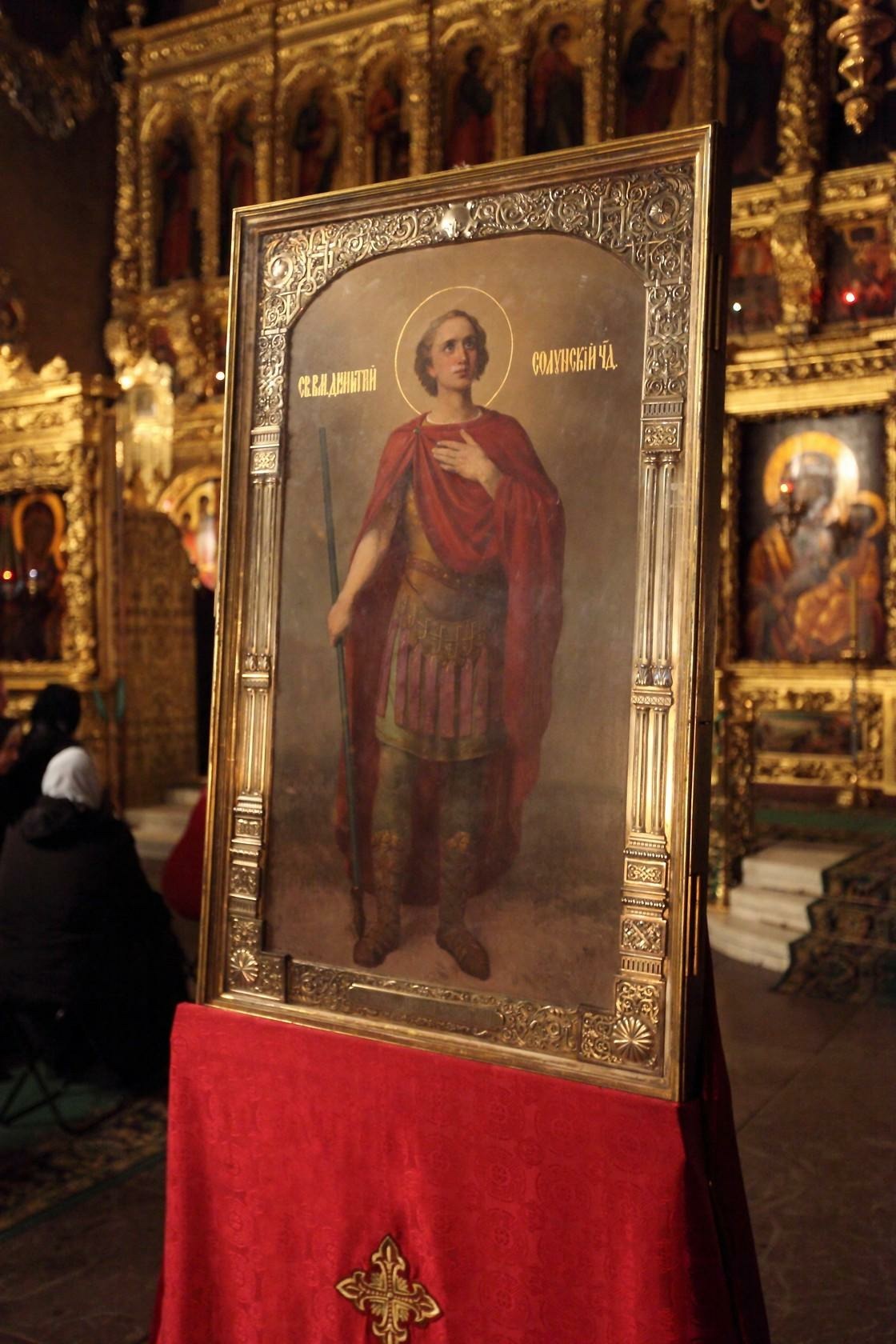 Святой великомученик Димитрий Солунский – небесный покровитель московского князя Димитрия Донского (+ 1389; память 19 мая), и его икона попала в обитель, где князь в XIV веке брал благословение на битву с Мамаем, в обитель, где с тех пор установлена и поныне совершается Дмитровская родительская суббота, в обитель, где благоверный князь был канонизирован в год празднования 1000-летия Крещения Руси»[4].