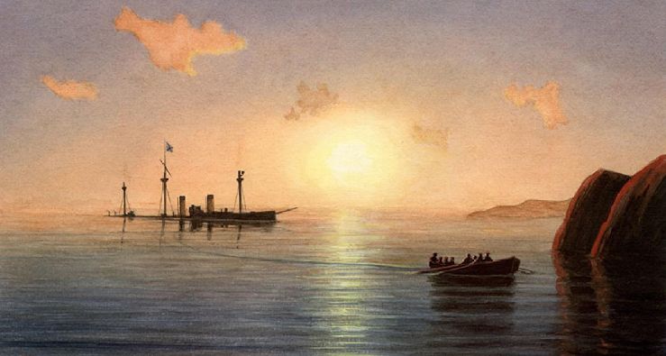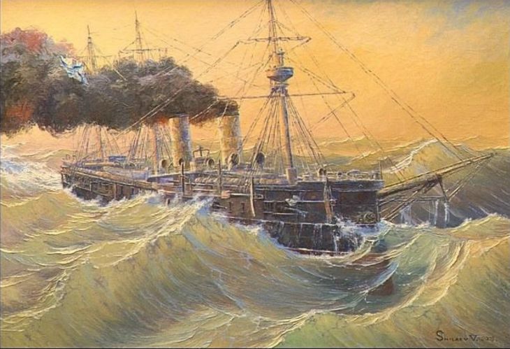 Через четверть часа после того, как я оставил крейсер, он сразу повалился на левый борт, а еще через минуту, набрав всем корпусом воды быстро выпрямился и скрылся под поверхностью моря, на глубине 100-200 сажен» …