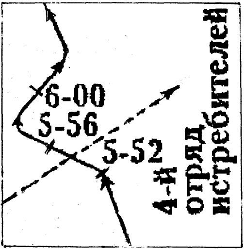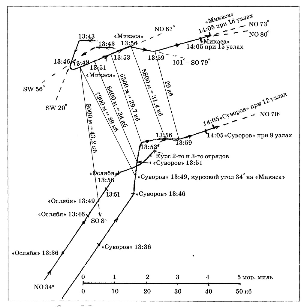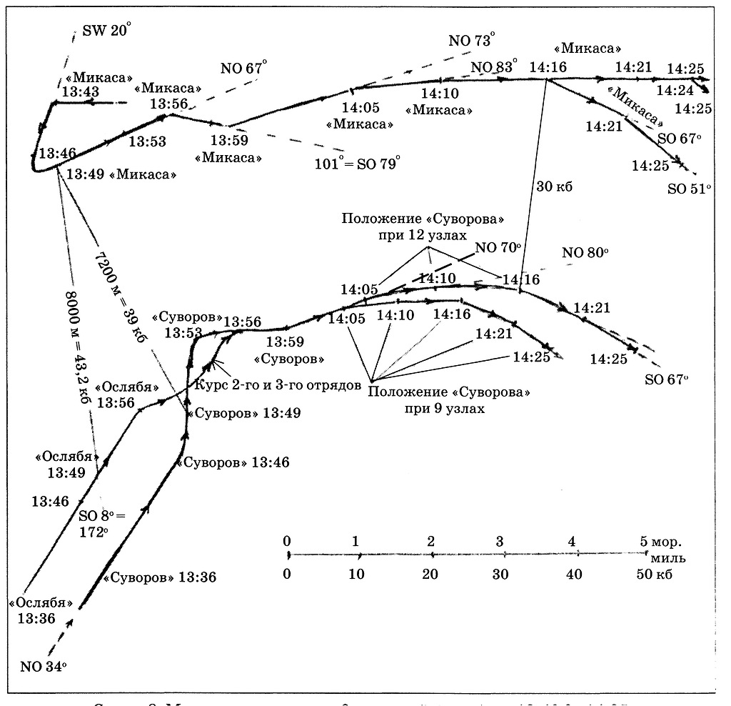 Расстояние это, как может проверить читатель с помощью линейки или иного измерительного инструмента, составляет немного более 5 морских миль, что соответствует эскадренной скорости 2-й эскадры − 15 узлов!