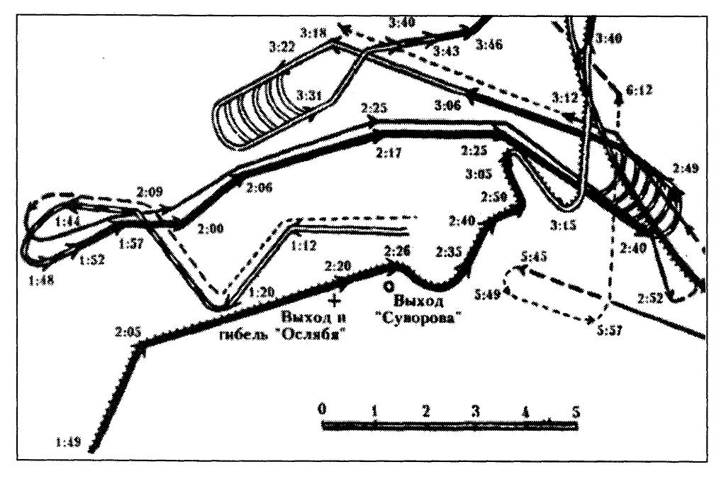 Однако из схемы 1 ясно видно, что положение флагмана русской эскадры в 13:49, при размещении его на карте в соответствии с указанными условиями, совпадет с положением, занимаемым «Князем Суворовым», ‒ по мнению составителей схемы, ‒ в 14:05, а, следовательно, окажется существенно севернее.