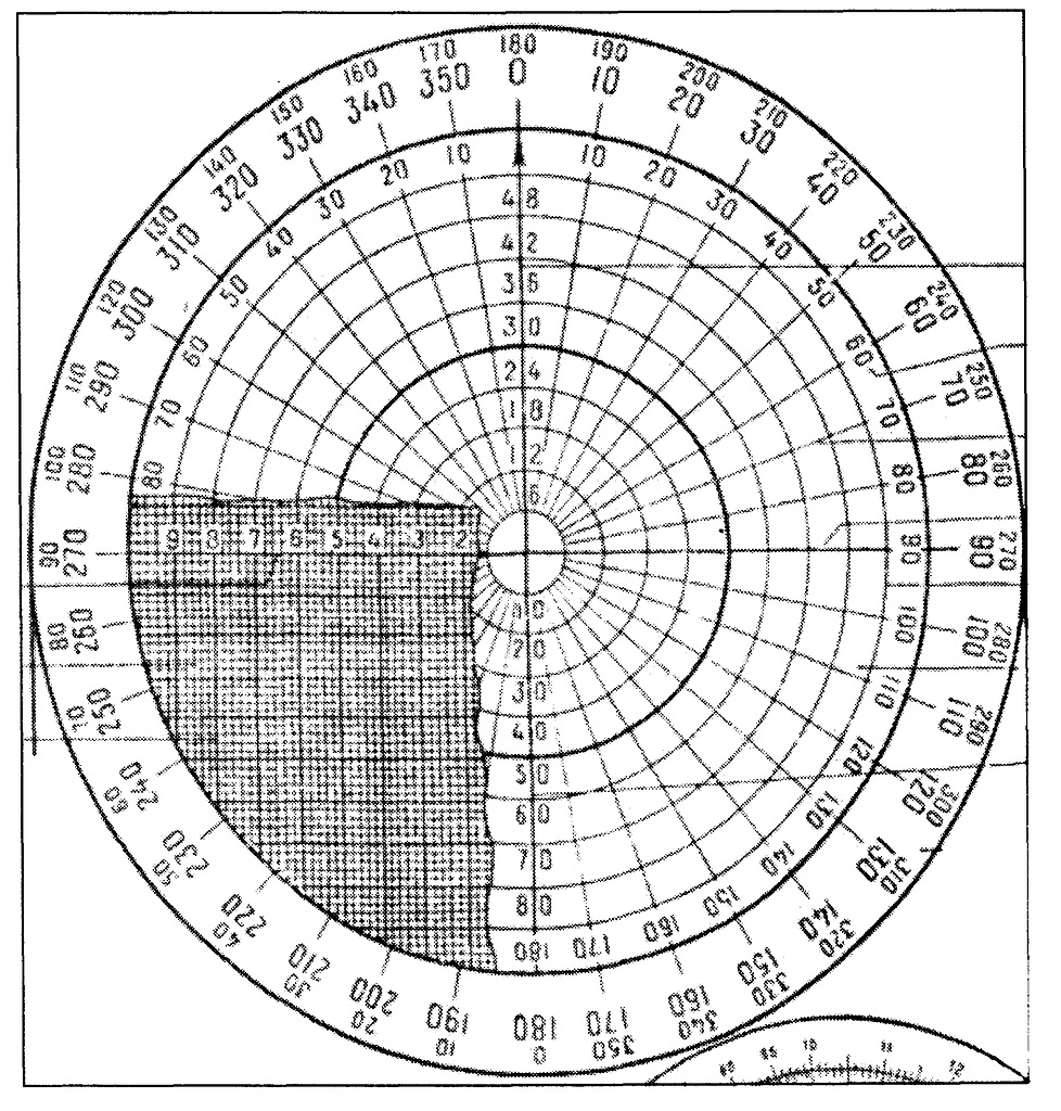 Но уже курс 90º планшета соответствует чистому Ost. А курс 91º планшета − уже курсу SO 89º. Курс 101º − курсу SO 79º. Напротив, курс SO 11º соответствует курсу 169º, а обратный к нему курс NW 11º − курсу 349º. Также курс NW 34º соответствует курсу 326º на планшете и так далее. Так что, если в дальнейшем тексте будут встречаться, особенно при цитировании источников, как буквенные, так и чисто числовые значения курсов, читатель теперь легко найдет их взаимное соответствие.