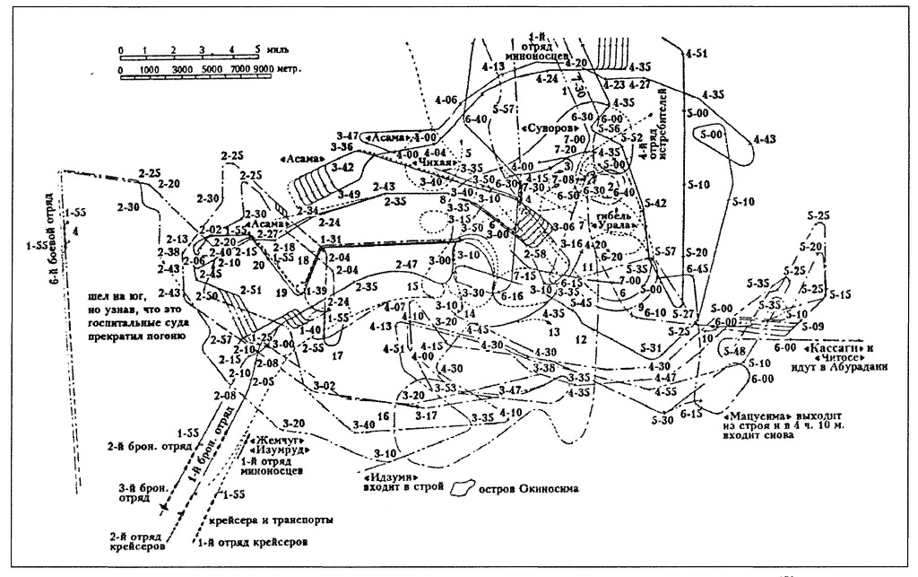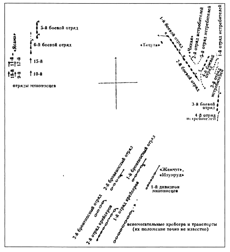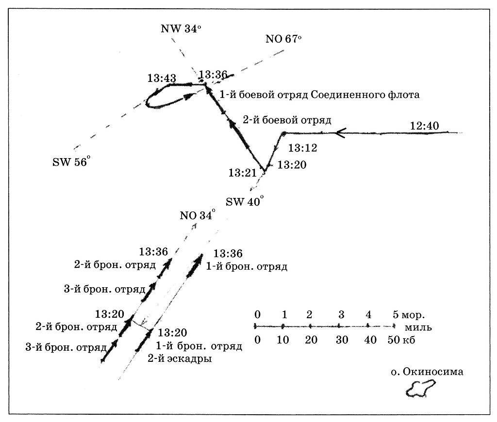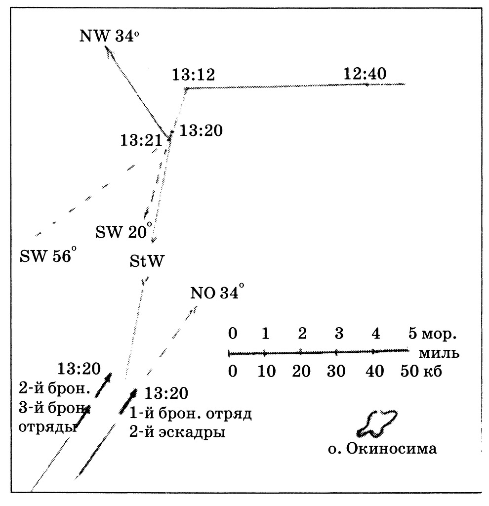 Судя по приведенной в «Сражении…» общей схеме боя 14/27 мая 1905 года (схема 2)[9], в 12часов 40 минут (напомним еще раз, что здесь и далее, кроме особо оговоренных случаев, время русское) адмирал Того во главе 1-го и 2-го боевых броненосных отрядов Соединенного флота находился в 9-10 милях к северу от острова Окиносима. И шел курсом практически чистый вест со скоростью порядка 9-10 узлов до 13 часов 12 минут.