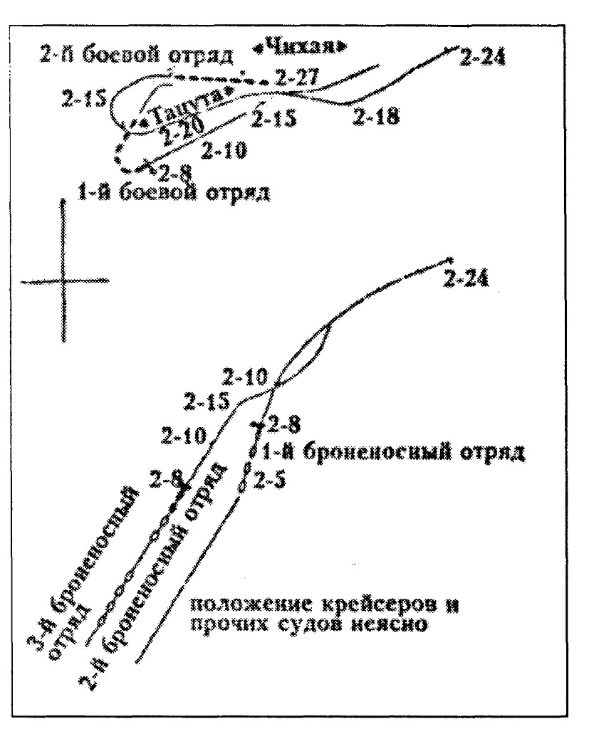 Схема II. Схема маневрирования главных сил Соединенного флота и 2-й эскадры перед началом огневого контакта