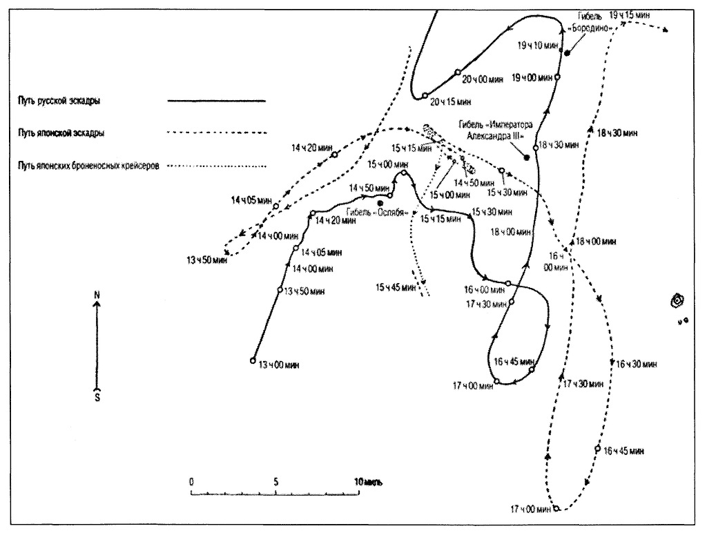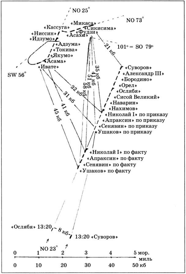 Достаточно указать, что на схеме дано совершенно верное положение флагманских кораблей «Суворова» и «Микаса» в 13:49, отражен поворот «Суворова» на север в 14:00, − четко указанный только в рапортах адмирала Рожественского, и курс нашей эскадры NO 45° с 14:05 до 14:25. Положение японской эскадры в 14:25 в главном также соответствует здесь словам рапорта Адмирала.