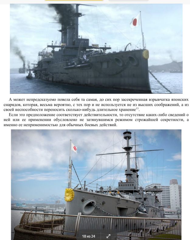 [13] «Причиной взрыва и гибели современного броненосного корабля стало неосторожное обращение вконец уставшего экипажа с … легко детонирующей шимозой». − Шишов А.В. Неизвестные страницы русско-японской войны (1904-1905). – М., 2004. С. 369. Той самой шимозой?