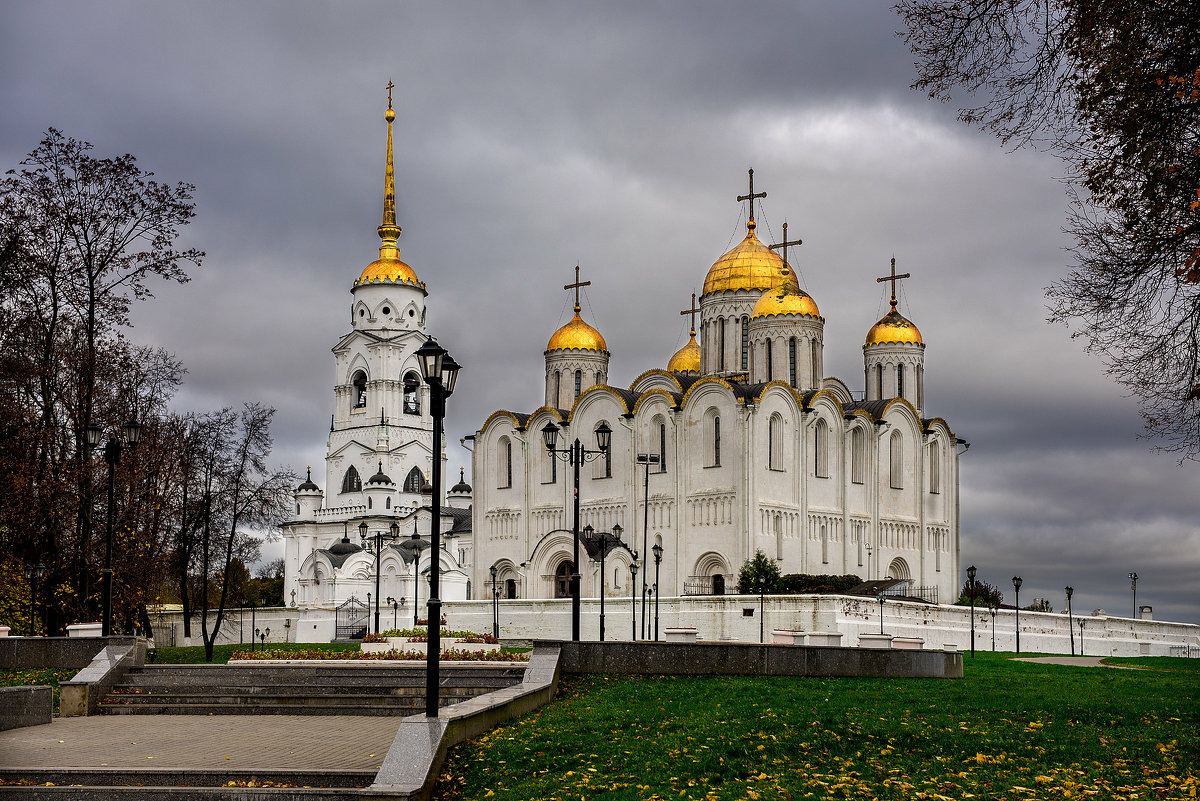 Белокаменный Успенский собор Владимира был возведен в 1158–60 гг. по указанию св. князя Андрея Боголюбского, ставшего правителем всей Суздальской земли в 1157 году, после смерти своего отца Юрия Долгорукого. Изначально собор имел три притвора, три алтаря и пять глав. По высоте он превосходил ранее построенные в Киеве и Новгороде Софийские соборы (более 3-х метров). Роспись 1408 г. – Рублев и Черный. Новый иконостас 1774 года. В 1299 г. сюда перенесли резиденцию митрополита.