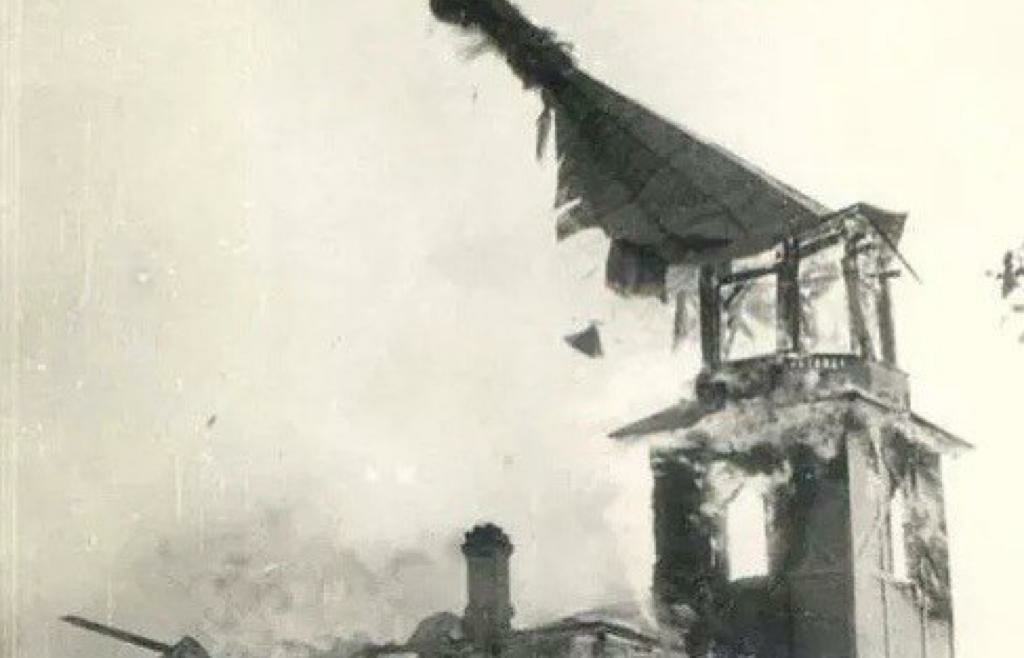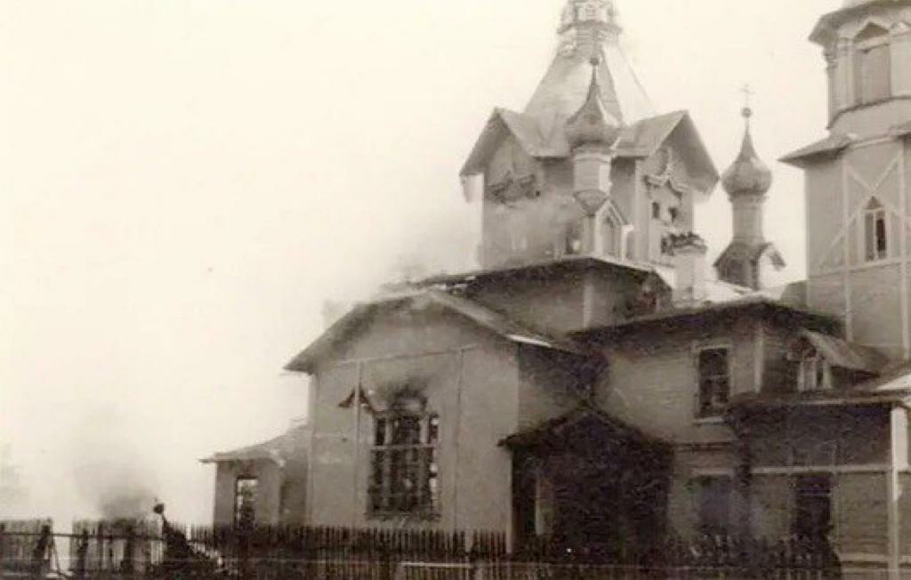 Наступили годы лихолетья. Однако, как это не удивительно, в 1930-е годы храм не был разрушен. Он периодически закрывался и открывался, некоторых священников арестовывали. Но храм держался. Когда наступила Великая Отечественная война и немцы подошли к городу, здесь проходила линия фронта. Эта территория была оккупирована, здесь стояли регулярные части немецко-фашистских войск. Согласно полученным нами документам, храм Преображения Господня в Лигово входил в зону ведения Псковской миссии. Долгое время существовало мнение, что храм был сожжен нашими войсками, но недавно я получил фотографии из немецкого архива, на которых видно, как фашисты с факелами лезут на колокольню и поджигают деревянный храм. Это был ориентир для наших войск и немцы перед уходом сожгли его.