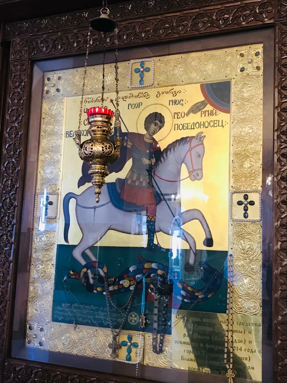 У нас большая община грузин. Они мне очень помогают в постройке храма. Святейший Патриарх, Католикос всей Грузии Илия освещал лично для нашего храма икону Георгия Победоносца. Мы были у него на приеме, он освятил икону и благословил нас. В подарок мы дали ему «Хлебную икону» Божией Матери.