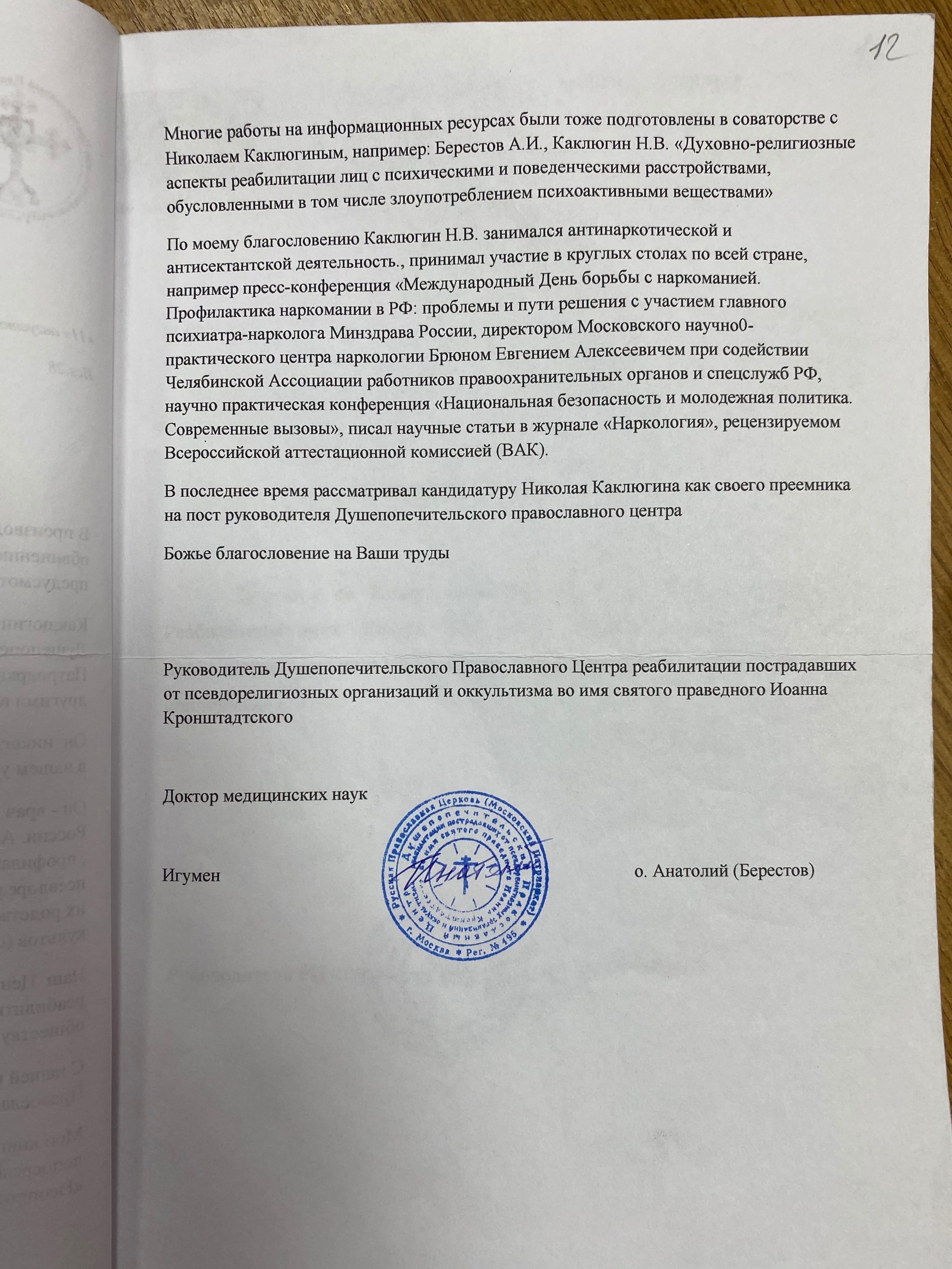Фото 2, 3. Копия справки за подписью руководителя Душепопечительского православного центра во имя святого праведного Иоанна Кронштадтского Московской Патриархии, д.м.н., игумена Анатолия (Берестова).