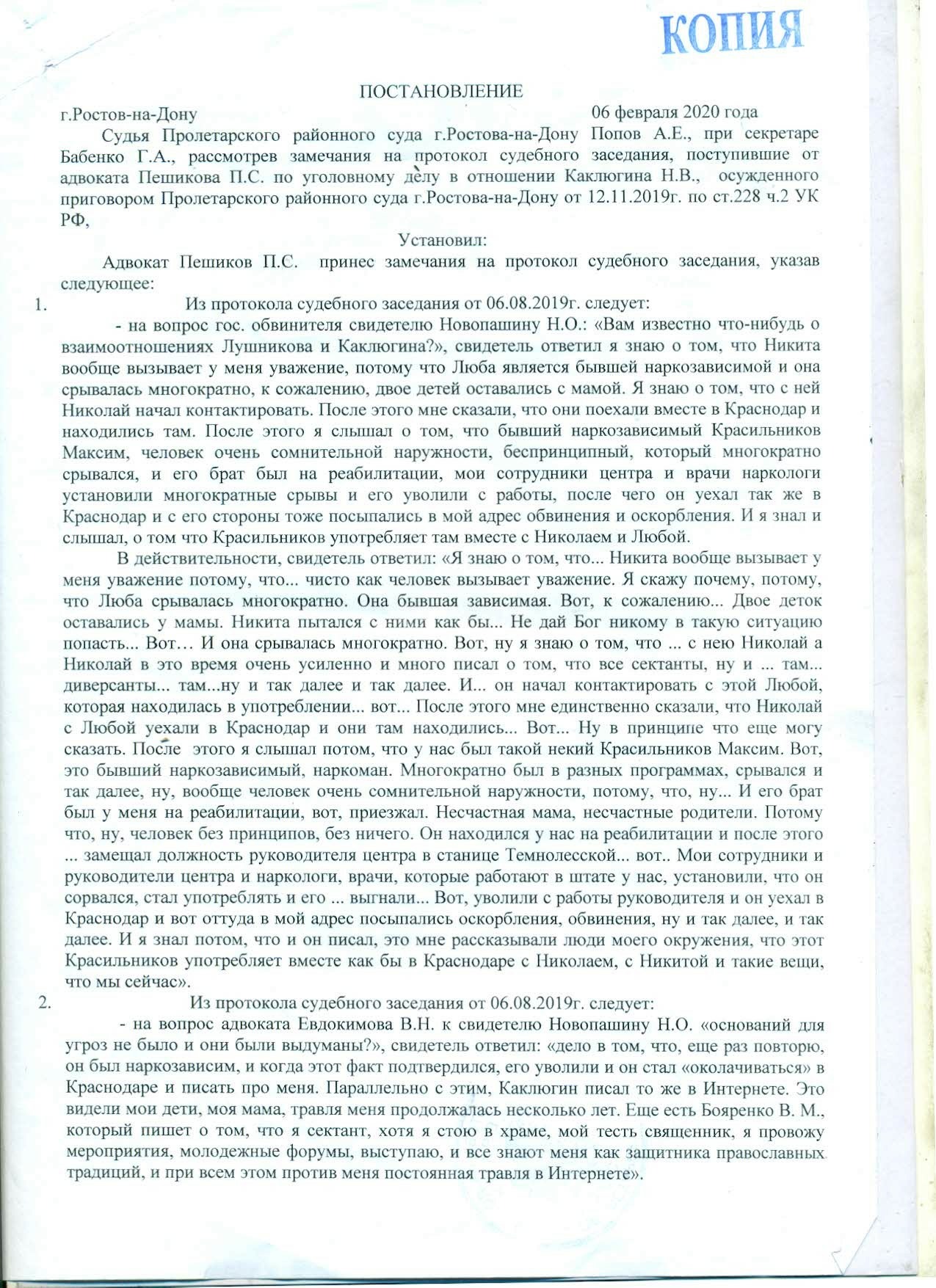 Фото 7, 8. Копия постановления судьи Попова А.Е. от 06.02.2020 г. об оставлении без удовлетворения замечаний адвоката Пешикова П.С. на протоколы судебных заседаний.