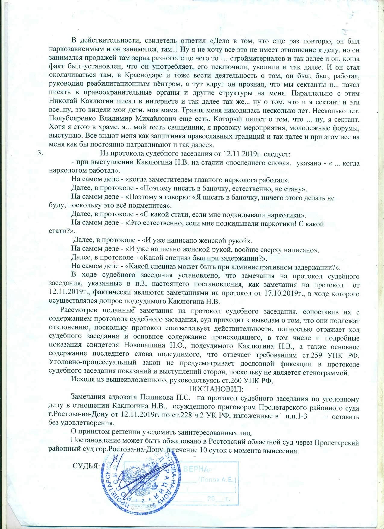 В свете всего только что сказанного вернусь к ключевым моментам упоминаемого мной ранее в выступлении постановления судьи Попова А.Е. от 06.02.2020 г. об оставлении без удовлетворения замечаний адвоката Пешикова П.С. на протоколы судебных заседаний по настоящему уголовному делу от 06.08.2019 г. и 17.10.2019 г. Отмечу те моменты, что отказался изменить, поправить, вернуть в оригинальный вид в стенограмме 17.10.2019 г.