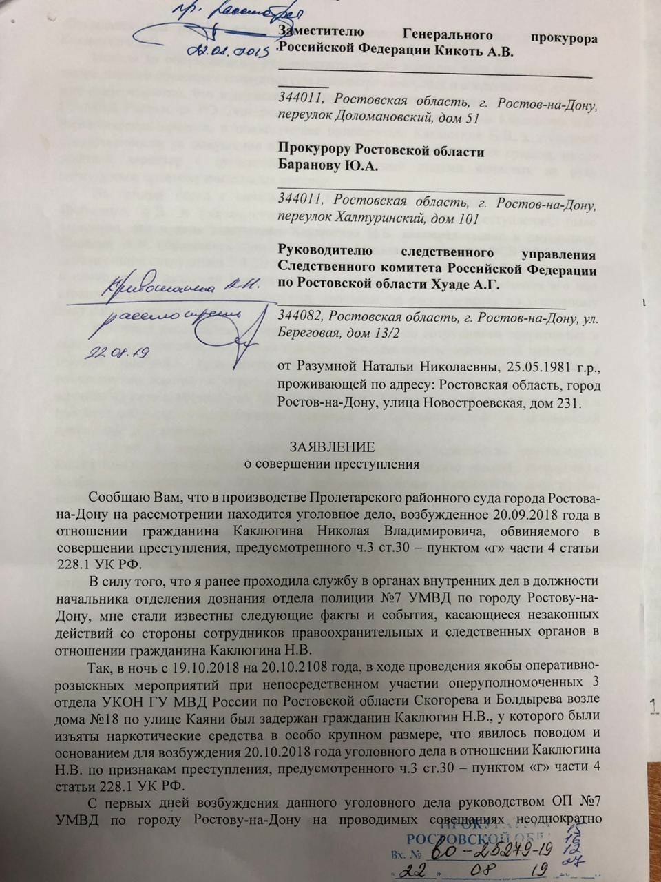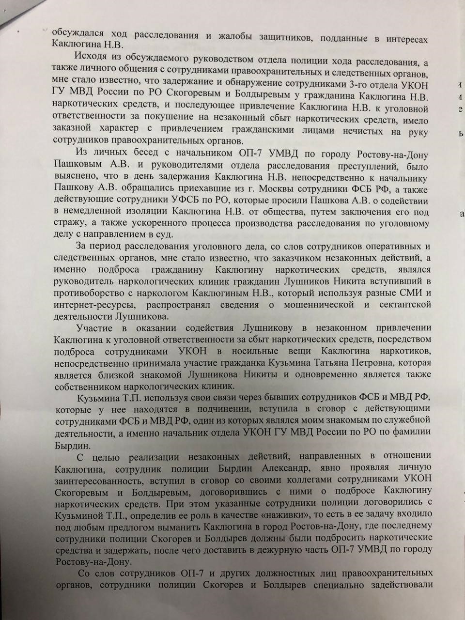 “Тем же днем, 11.01.2019 г. датирован протокол ознакомления меня и защитника-адвоката Пешикова П.С. с одним из экспертных заключений по делу. [Кстати говоря, это заключение экспертов № 2/1241 от 02.11.2018 г. о том, что изъятый у меня во время задержания 19.10.2018 г. телефон «Lenovo Zuko 2» нерабочий. Это было видно и без экспертизы визуально – он разбит, SIM-карта на стенде экспертов не включилась. Ведь мой личный, работающий мобильный телефон «Iphone 6S» с памятью 128 Гб, сетевым адаптером и шнуром, важной оперативной информацией в нем все по тому же НАС и Н.В. Лушникову, их противоправной деятельности, полученной мною в том числе совместно с оперативниками УФСБ по Московской области и г. Сочи, в Краснодарском крае, был похищен открытым, совсем не тайным образом, как утверждало изначально, продолжает утверждать и сейчас следствие, у меня во время задержания 19.10.2018 г., то есть по сути, я был ограблен, на меня в этом смысле было совершено разбойное нападение, о чем я также говорил в судебных допросах, но и это ни судью Попова А.Е., ни представителей прокуратуры Пролетарского района г. Ростова-на-Дону Д.П. Вернигора и С.О. Баранова нисколько не заинтересовало, дополнительных вопросов не вызвало, в том числе то, что принадлежащий мне абонентский номер +7-9*****-70-00, SIM-карта с которым находилась в похищенном у меня «Iphone 6S», через 3 дня после задержания, 22 и 23 октября 2018 года включилась в г. Краснодаре. Почему все это их, казалось бы проводивших судебное следствие, не заинтересовало, ведь оно связано непосредственно с моментом моего задержания, появления рядом со мной свертка с наркотиками руками тех же лиц, что, вероятно, и похитили у меня 19.10.2018 г. в районе 22:00 на выходе из верхней калитки из парка имени Октябрьской революции на ул. Каяни мой мобильный телефон «Iphone 6S» с сетевым адаптером и шнуром???!!!]. Так вот, помимо недопустимого в подобного рода серьезных документах [как экспертизы в данном случае телефонного аппарата] исправления …/…/… (по кабинетам, где проводилось ознакомление с протоколом), снова следователь Швецова И.С. совершает должностное преступление, солгав, написав и здесь, что я от подписи отказался. Ситуацию вновь проясняет прописанное моим адвокатом Пешиковым П.С. в конце протокола заявление: «Считаю ознакомление с заключением № 2/1241 от 02.11.2018 г. не проведенным, поскольку обвиняемый Каклюгин Н.В. до начала ознакомления заявил о плохом состоянии здоровья и вызове сотрудников мед.части СИЗО №3 (на данный момент никто еще не прибыл из сотрудников мед.части). Каклюгин Н.В. визуально и на слух воспринимать информацию не в состоянии здоровья – левая почка (колики), цвет лица (белый)». Ниже следователь Швецова И.С. спокойно записывает: «Протокол прочитан вслух следователем лично». И снова далее: «От подписи отказался». См. лист 99 тома 1 материалов судебного дела.