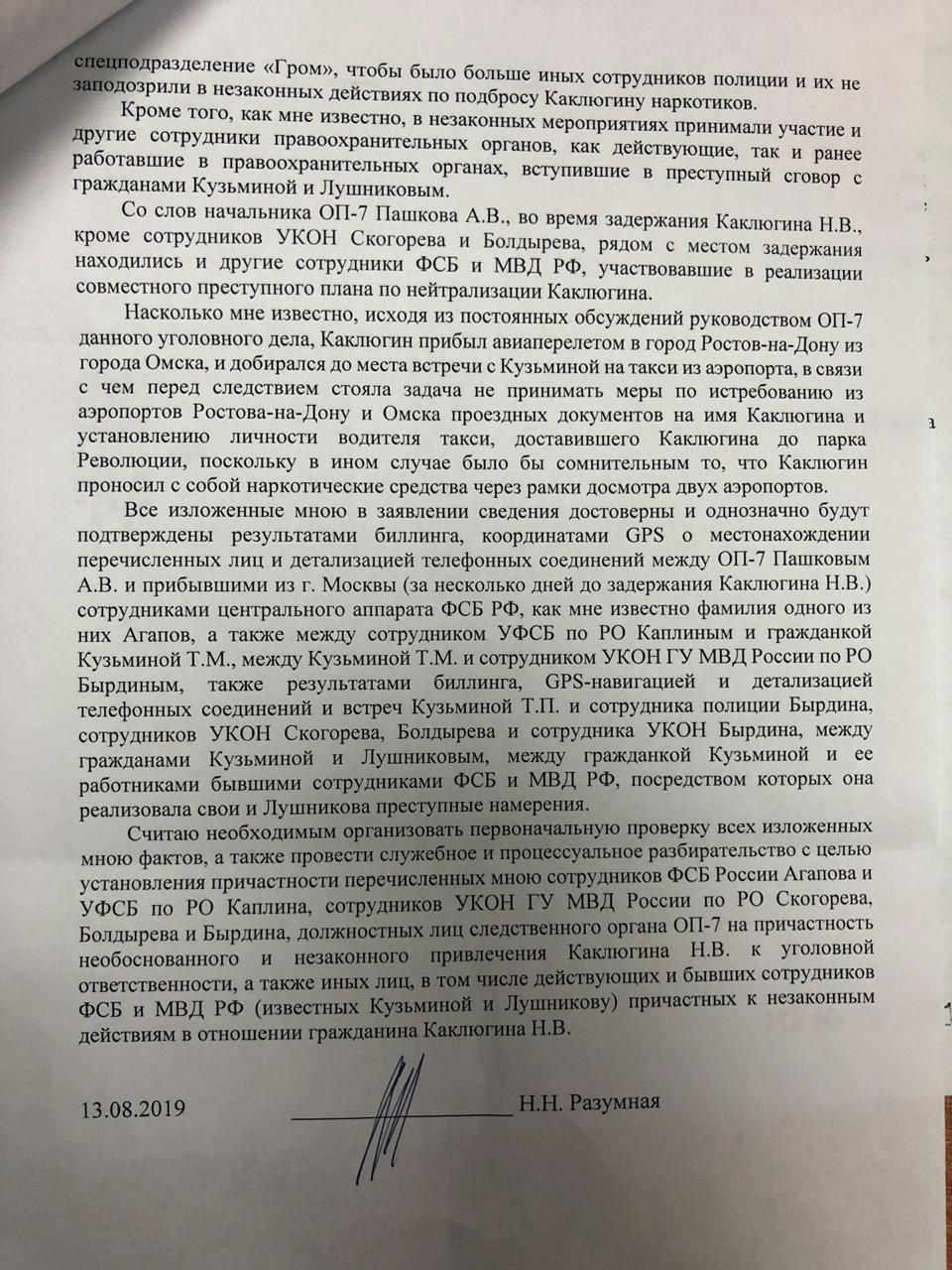 Н.В. Каклюгин: С учётом того, что я озвучил, по поводу Н.Н. Разумной, по поводу сотрудников ФСБ России, которые курировали моё задержание [Агапов, Каплин и Возилов], по поводу начальника Отдела полиции №7 Пашкова, который заявил о том, что меня необходимо экстренно поместить в СИЗО, это всё идёт в сумме, это статья 210 [УК РФ]. Это касается непосредственно, что мне были подброшены наркотики, где нет на свёртке никаких отпечатков пальцев, похищен телефон с оперативной информацией.