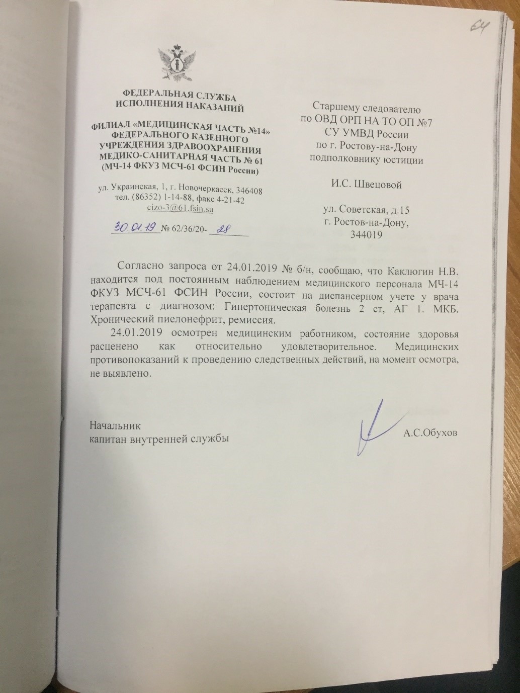 В материалах дела вообще отсутствует сообщение из ФКУ СИЗО-3 ГУ ФСИН России по Ростовской области к следователям М.А. Бортниковой и И.С. Швецовой, либо запросов от них, как и информации от начальника филиала МЧ-14 ФКУЗ МСЧ-61 ФСИН России (мед.части СИЗО-3 г. Новочеркасска, где я нахожусь), на тот момент капитана внутренней службы, ныне уже майора А.С. Обухова о том, что с 20.11.2018 г. по 30.12.2018 г. и с 11.01.2019 г. по 28.01.2109 г. я отказывался от приема пищи, о входе в голод, начале таких протестных акций, их причинах, или завершении таковых в первом случае, с объяснениями для прокуратуры по территориальности (г. Новочеркасска) причин выхода из голода. Лист 64 тома №3 копии материалов судебного уголовного дела содержит ответ А.С. Обухова № 62/36/20-28 от 30.01.2019 г. на запрос старшего следователя по ОВД ОРП на ТО ОП №7 СУ УМВД России по г. Ростову-на-Дону И.С. Швецовой о моем состоянии здоровья и степени способности участвовать в следственных действиях. Запрос был направлен как только ей поступила информация о моем выходе из голода 28.01.2019 г.