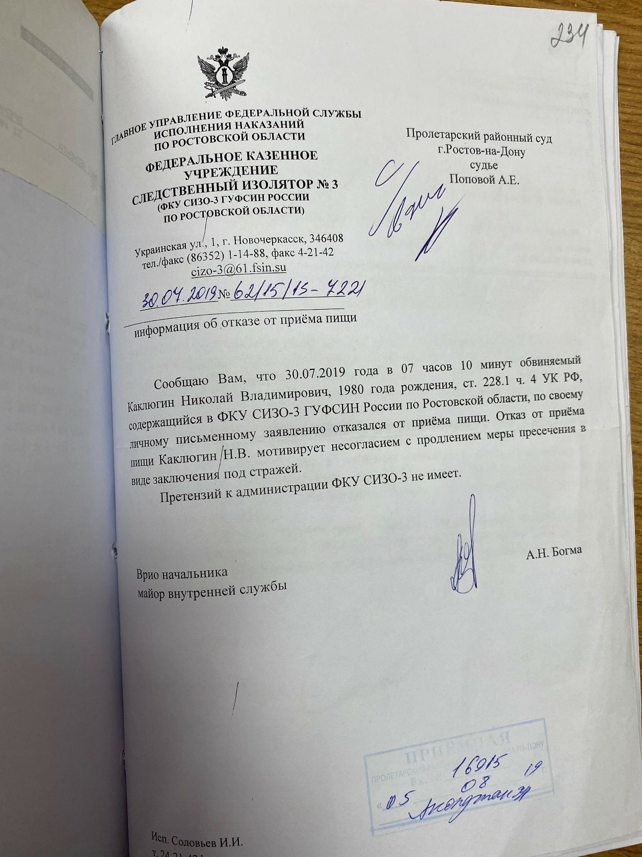 Это информационное письмо от 30.07.2019 г. за подписью вр.и.о. начальника СИЗО-3 г. Новочеркасска, майора внутренней службы А.Н. Богма на имя федерального судьи Пролетарского районного суда г. Ростова-на-Дону Попова А.Е., в котором сообщается следующее: «… 30.07.2019 года в 07 часов 10 минут обвиняемый Каклюгин Николай Владимирович, 1980 года рождения, ст. 228.1, ч. 4 УК РФ, содержащийся в ФКУ СИЗО-3 ГУ ФСИН России по Ростовской области, по своему личному письменному заявлению отказался от приема пищи. Отказ от приема пищи Каклюгин Н.В. мотивирует несогласием с продлением меры пресечения в виде заключения под стражей. Претензий к администрации ФКУ СИЗО-3 не имеет». Внизу пропечатан входящий номер полученного судом документа – №16915, и дата получения, постановки на внутренний учет – 05.08.2019 г. Вот так это происходит по закону.