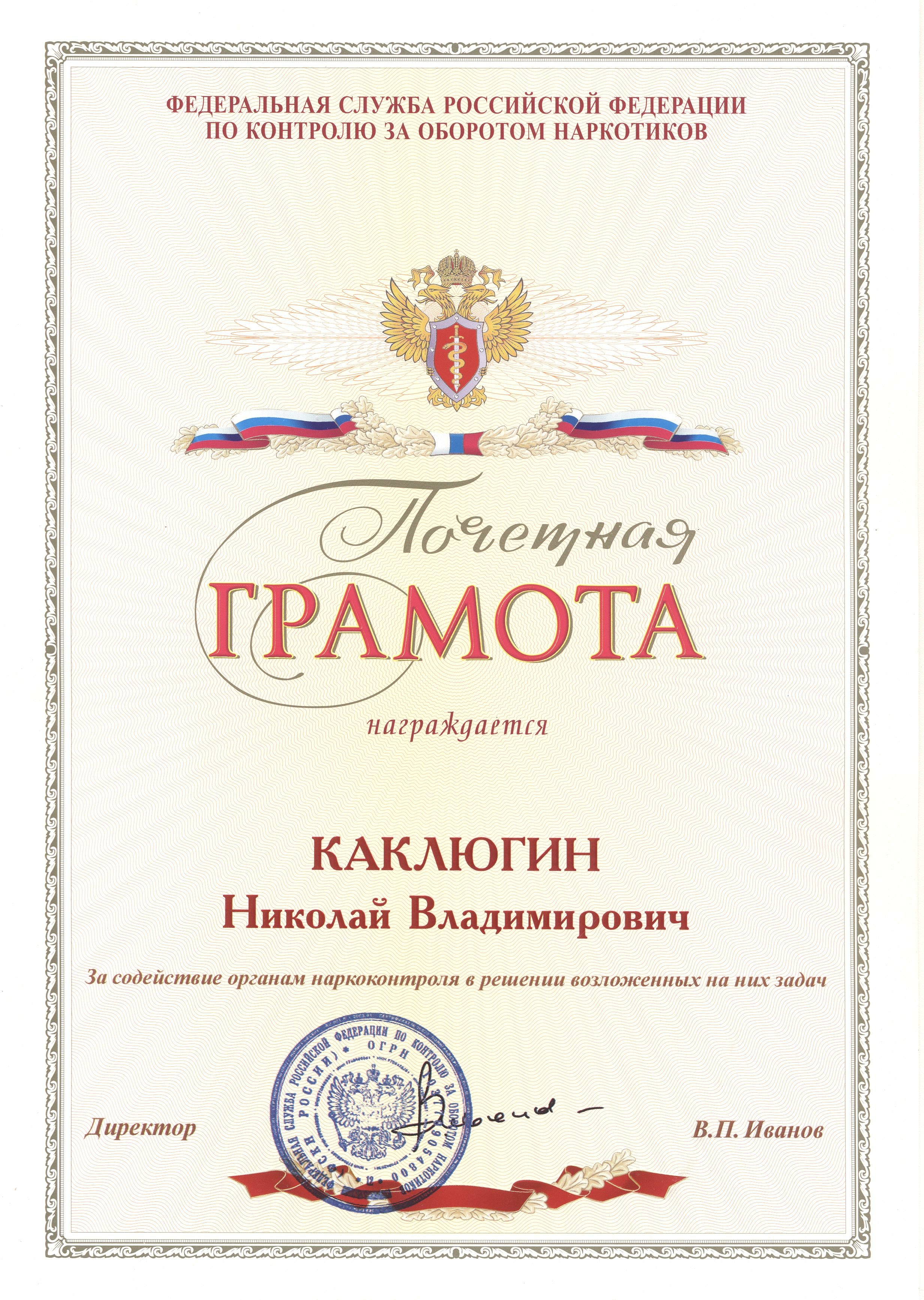 Каклюгин Н.В. внёс большой вклад и в научные разработки, связанные с феноменом наркомании и реабилитационными методиками по решению данной проблемы в Российской Федерации…/…/… неоднократно привлекался для экспертных оценок различных противонаркотических программ на самом высоком уровне, систематически совершенно безвозмездно выезжал во вновь образованные реабилитационные центры, где оказывал практическую помощь в работе с наркозависимыми.