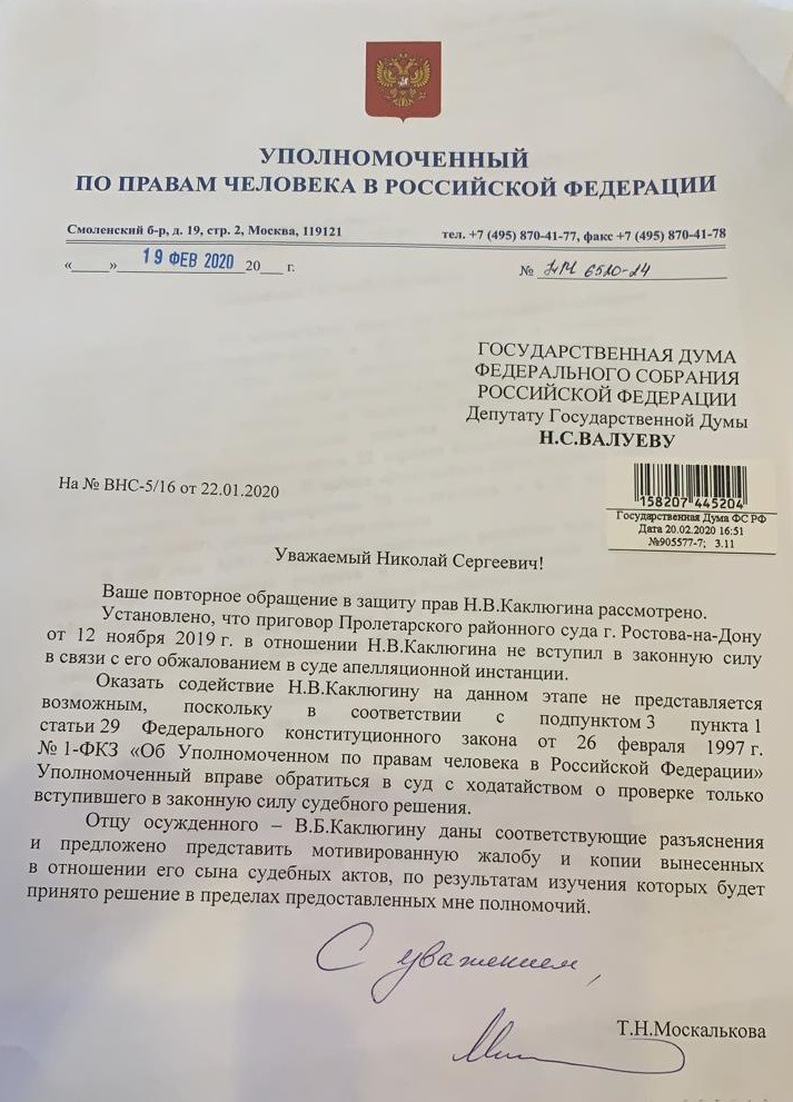 А мне при этом сообщается, что в ситуации с нарушением моих прав из ее аппарата наблюдают с момента моего задержания в октябре 2018 года. Создается стойкое ощущение, переходящее в убеждение, что это не просто наблюдение, а абсолютное и тотальное игнорирование нарушений моих прав и свобод аппаратом Т.Н. Москальковой, как и всех моих заявлений, обращений в ее адрес и на имя ее представителя в Ростовской области, господина Харьковского, в прошлом, как ни странно, длительное время занимавшего пост областного прокурора. Как следствие, защищает он права и интересы прокурорских работников в регионе, а не заключенных по сфабрикованным при их участии уголовным делам.