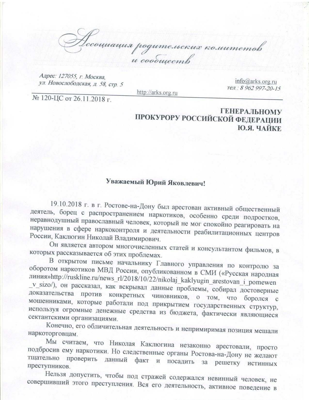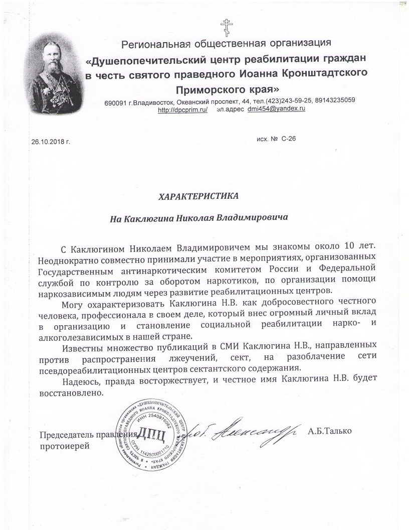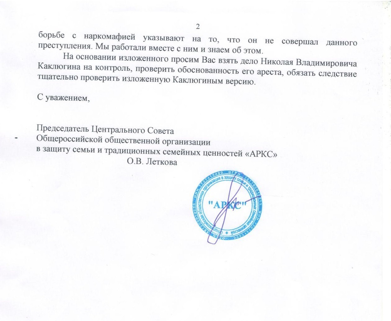 Каклюгин Н.В. является общественным деятелем и ведёт активную борьбу с различными деструктивными организациями, маскирующимися под реабилитационные структуры. Предполагаем, что задержание Каклюгина является спланированной провокацией представителей этих деструктивных структур». См. Приложение.