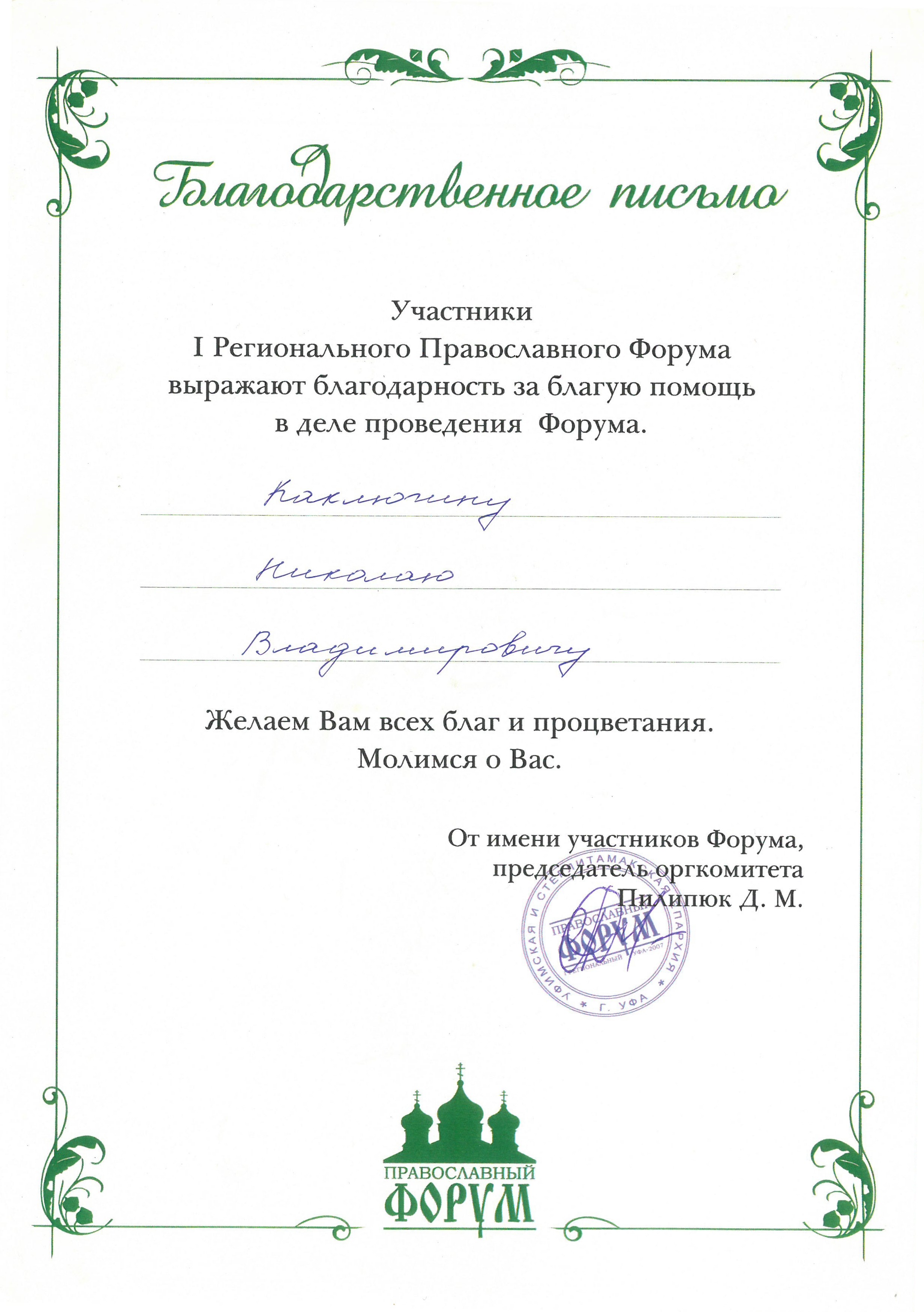 2009 год оставил в деле след в виде Благодарственного письма от председателя Организационного комитета I регионального Православного форума в г. Уфе «За благую помощь в деле проведения форума». См. Приложение.