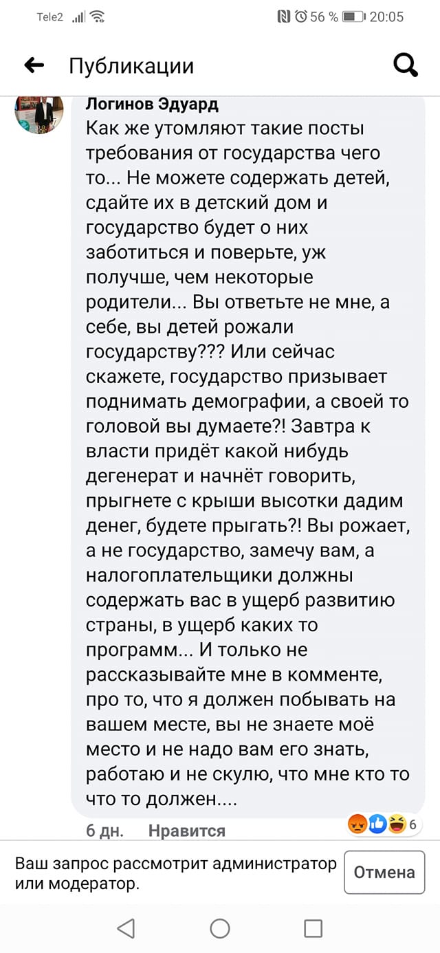 По следам инцидента, произошедшего 28 сентября под моим постом в Фейсбуке в группе "Комарова. Итоги" (с репостом из "Движение за права многодетных России"), когда член Общественной палаты Югры Эдуард Логинов позволил себе выразиться о многодетных семьях так что посоветовал сдавать детей в детский дом и использовал другие громкие выражения, которые сильно возмутили общественность как Югры, так и России. Как фигурантке этой малоприятной истории хотелось бы сказать следующее.