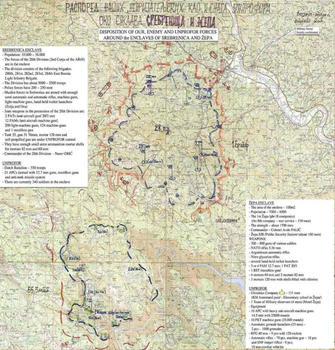 Карта командования боснийских сербов с позициями миротворцев и подразделениями 28 боснийской дивизии в анклавах Сребреница и Жепа.