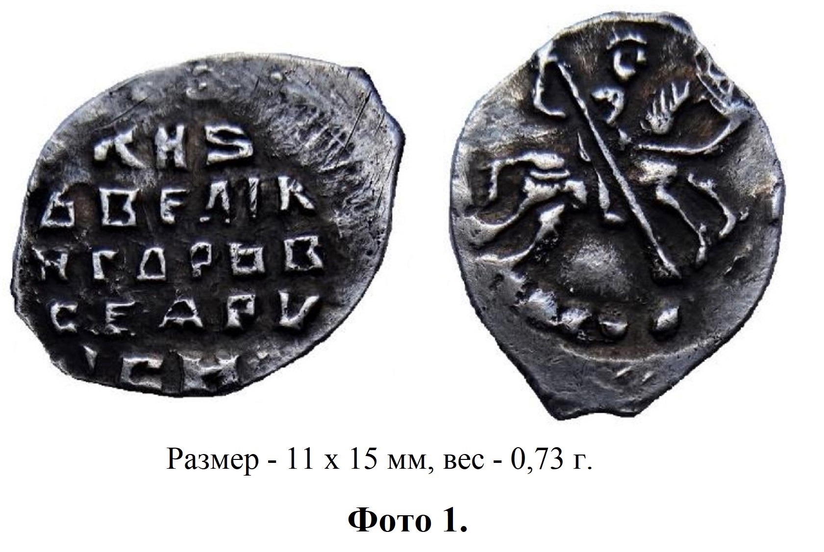 - «Копейка», относимая к монетному двору Новгорода [6, с. 18]: на лицевой стороне – сокращённая надпись («легенда») в пять строк «КНS / ЬВЕЛIК / НГДРЬВ / СЕѦРѴ / СН» («КН[Я]ЗЬ ВЕЛИК[ИЙ] И Г[ОСУ]Д[А]РЬ ВСЕЯ РУСИ»), на обратной стороне – всадник («ездец») с копьём на скачущем коне (вправо). Выявлено 268 экземпляров. (Фото 1.)