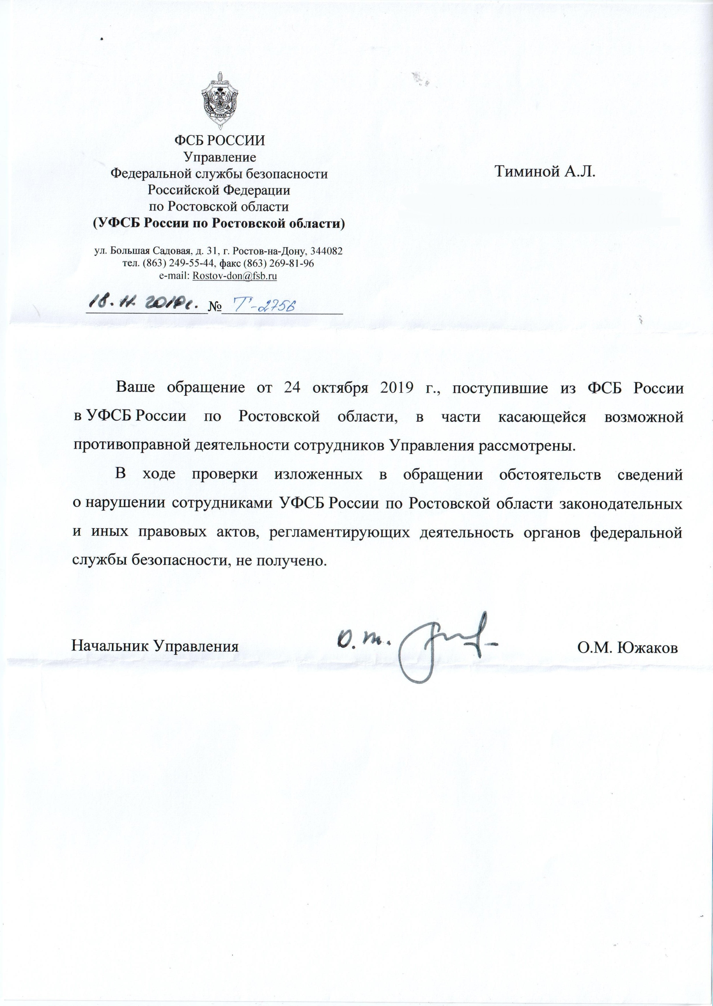 Несмотря на обращения в органы ФСБ России моего отца, Каклюгина В.Б. и А.Л. Тиминой, были получены ответы от начальника регионального Управления ФСБ России Южакова О.М., в которых сообщалось, что не было обнаружено никаких нарушений со стороны сотрудников данного регионального Управления.