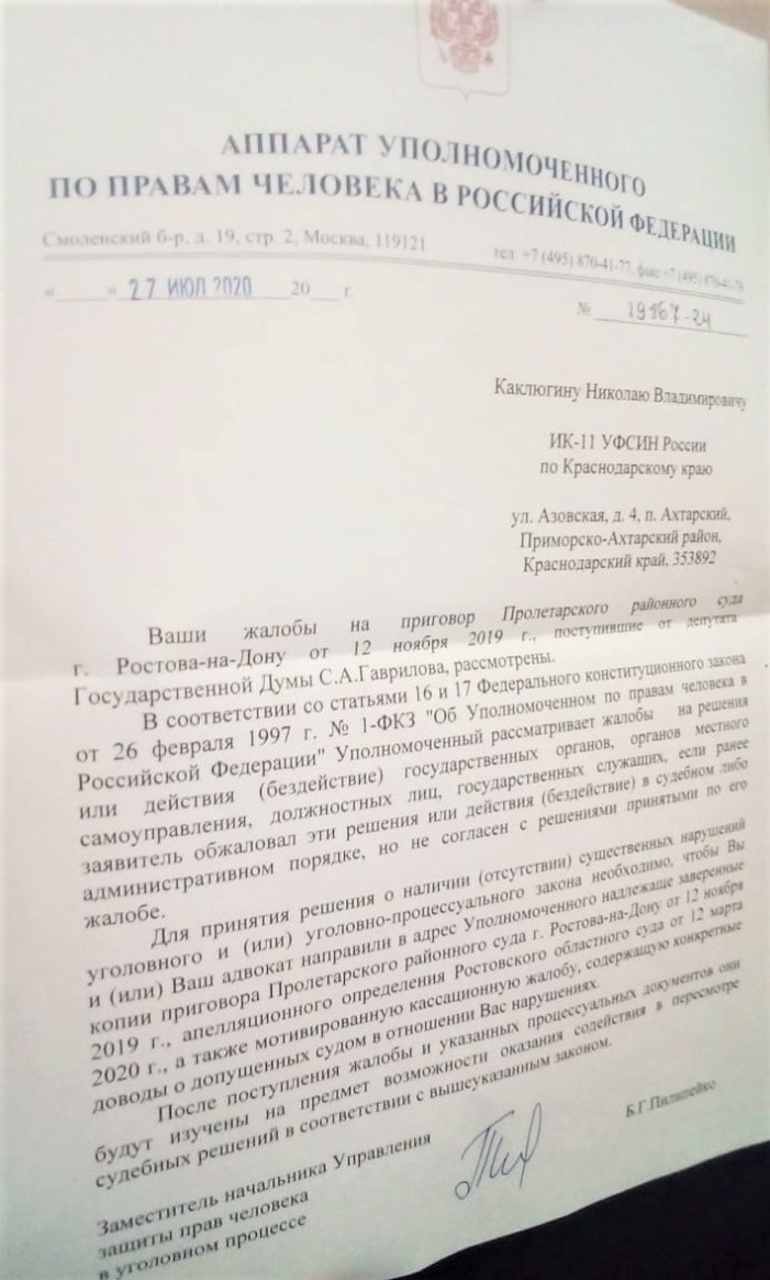 И даже когда были направлены затребованные документы, чтобы в суде кассационной инстанции была оказана поддержка со стороны аппарата Уполномоченного по правам человека в РФ, вдруг в процессе переписки с одним из достаточно высокопоставленных сотрудников отдела аппарата УПЧ РФ, буквально за несколько дней до назначенной даты заседания было сообщено, что вышеозначенные документы к ним от моего отца не поступали, хотя однозначен факт, что он им их направлял заблаговременно, чтобы они успели с ними ознакомиться и включиться в правозащитную деятельность в рамках уголовного судопроизводства. Таким образом, не раз данные обещания со стороны различных должностных лиц аппарата Татьяны Николаевны Москальковой, к сожалению, на момент подготовки и публикации данного материала оказались вымыслом. Подтверждением этому служит очередная формальная отписка того же господина Пилипейко на обращение моего отца, Каклюгина В.Б., к которому прилагались уже документы касательно только лишь обжалования стороной защиты приговоров судов первой и апелляционной инстанций.