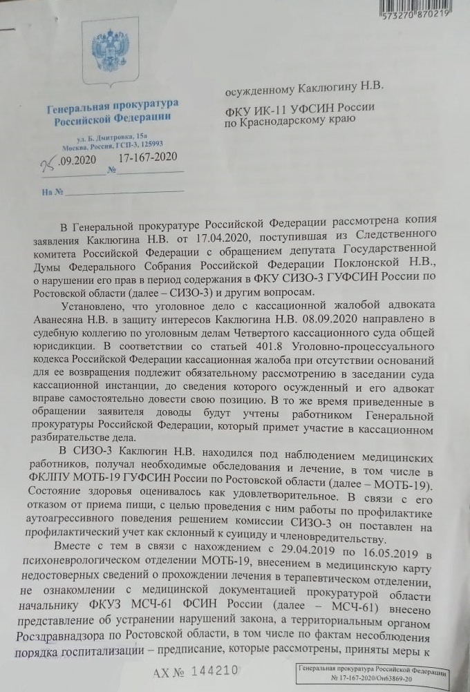 Показательно, что в ответе из Генеральной прокуратуры РФ от 25.09.2020 г. депутату Государственной Думы Наталье Поклонской, которая так же уже достаточно давно пристально наблюдает за развитием событий вокруг ситуации с неадекватным расследованием всех обстоятельств моего пенитенциарного устранения, нас: меня. сторону защиты и родственников уверяют, что направленное мною обращение от 17.04.2020 г. будет учтено в кассационном заседании: «В то же время приведенные в обращении заявителя доводы будут учтены работником Генеральной прокуратуры Российской Федерации, который примет участие в кассационном разбирательстве дела».