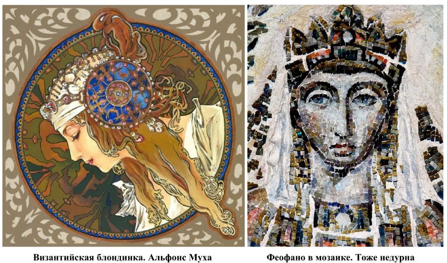 Да и многие другие, не только Ги и Эжен, не смогли противостать чарам ромейской красавицы, «взволновавшей мир столько же, сколько Елена, и даже больше». Так, в романе Гюга Леру Феофано предстает «женщиной красоты необычайной, с чертами камеи, заключавшими в своей гармонии силу, волнующую мир». Говорят, именно ее образ вдохновлял Альфонса Муха, когда от творил портрет «Византийской блондинки».