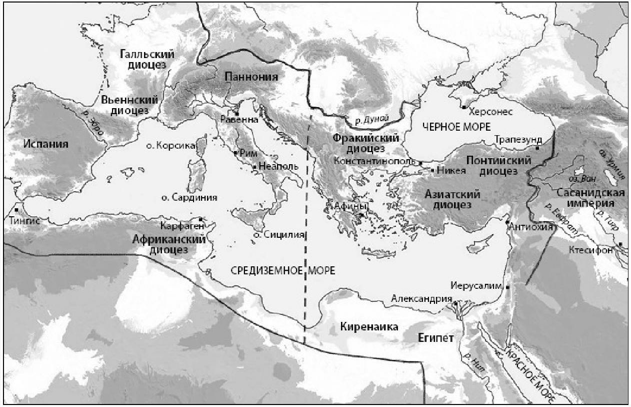 Напомним, что административный раздел Империи Феодосием Великим в 395 году следовал по линии границы между Востоком и Западом, впервые проведенной Диоклетианом (284-305), который разделил весь Средиземноморский бассейн почти ровно пополам, в меридиональном направлении примерно по 19 меридиану. Раздел Империи не был разделом политическим, поскольку оба императора совместно правили обеими ее частями. Тем не менее в результате него Восточная Римская Империя оказалась состоящей из трех частей на трех различных континентах.