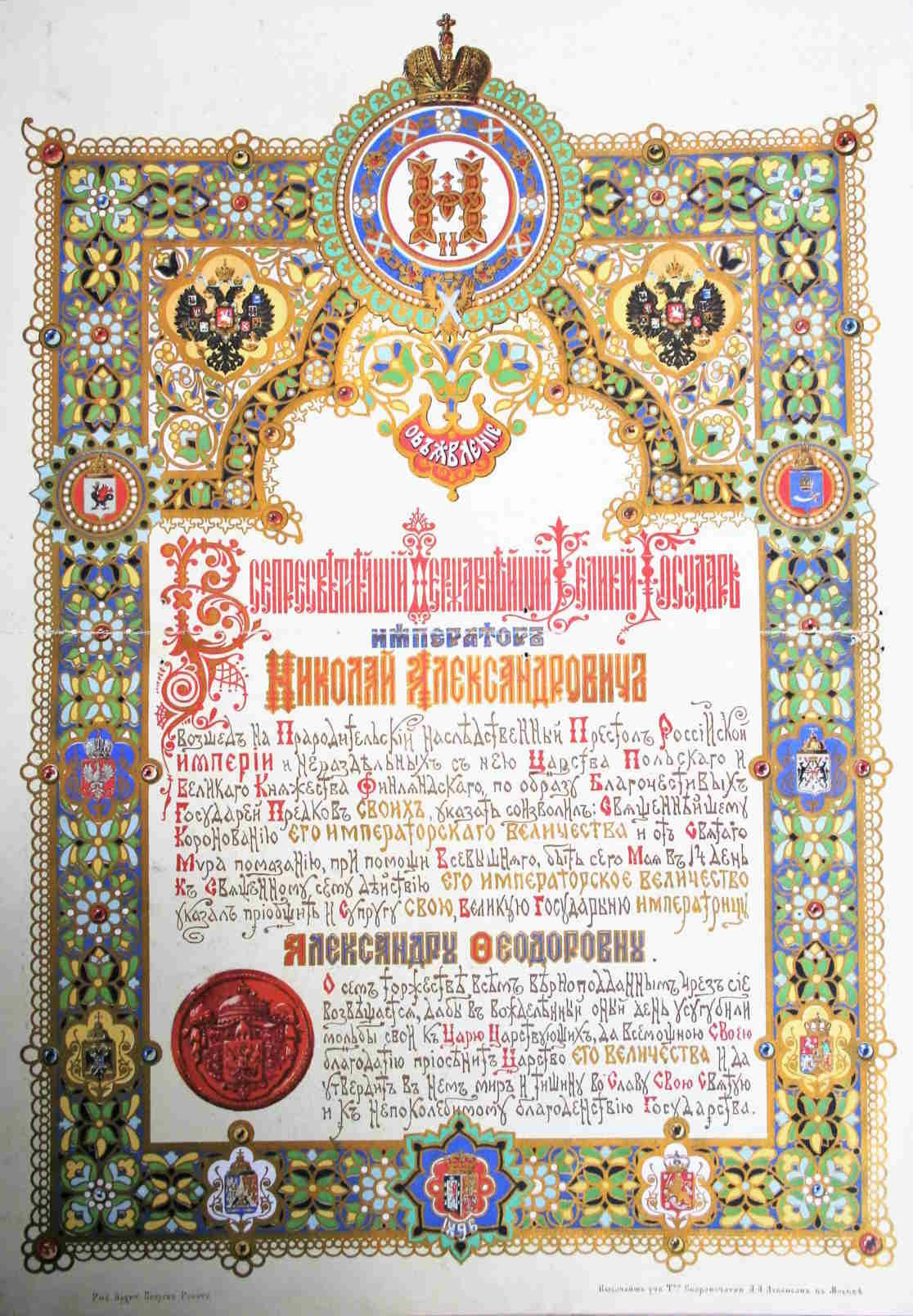 Высочайший Манифест о Священном Короновании Императора Николая Александровича и Императрицы Александры Фёдоровны, имеющем состояться 14 мая 1896 года