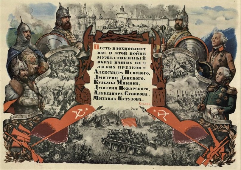 Плакат времен Великой Отечественной войны — Великие Князья Александр Невский, Дмитрий Донской, Князь Дмитрий Пожарский, гражданин Кузьма Минин, генералиссимус Александр Суворов, фельдмаршал Михаил Кутузов