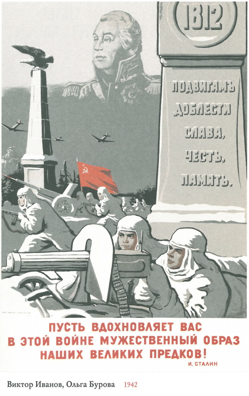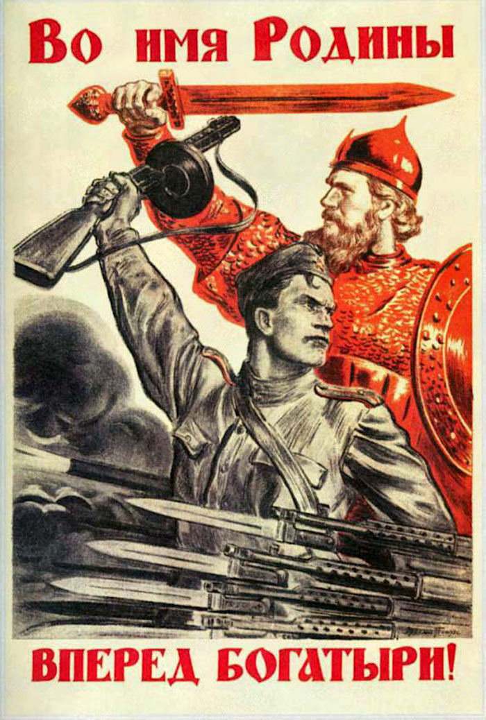 Но и после победного контрнаступления под Москвой впереди были еще три с лишним года Великой Отечественной войны. Бойцы Красной Армии вдохновлялись новыми призывами. «Ни шагу назад!» (28 Июля 1942 года), «Отстоим, Волгу-Матушку!» (1942) — в сражении за Сталинград. «Вперед, на Запад, красные конники!», «Кто с мечом к нам придет, от меча и погибнет» — 1942 год. После Курской битвы война с нашей стороны приобрела наступательный характер, бойцов вдохновляли плакаты с лозунгом: «Смелость города берет!» (8 Сентября 1943 года), «На Запад!»[22]. Все эти и другие боевые кличи Великой Отечественной войны вполне отвечали многовековой сугубо русской духовной традиции.