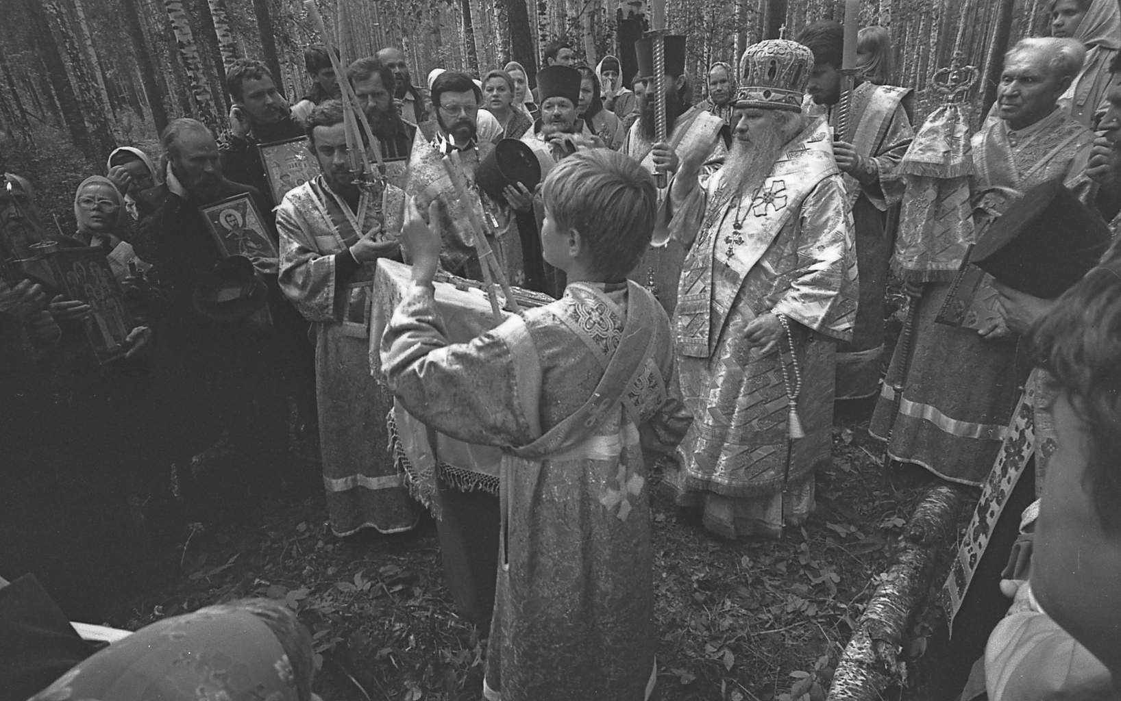 Архиепископ Мелхиседек совершает первую архиерейскую панихиду на Ганиной яме. 1993 год.