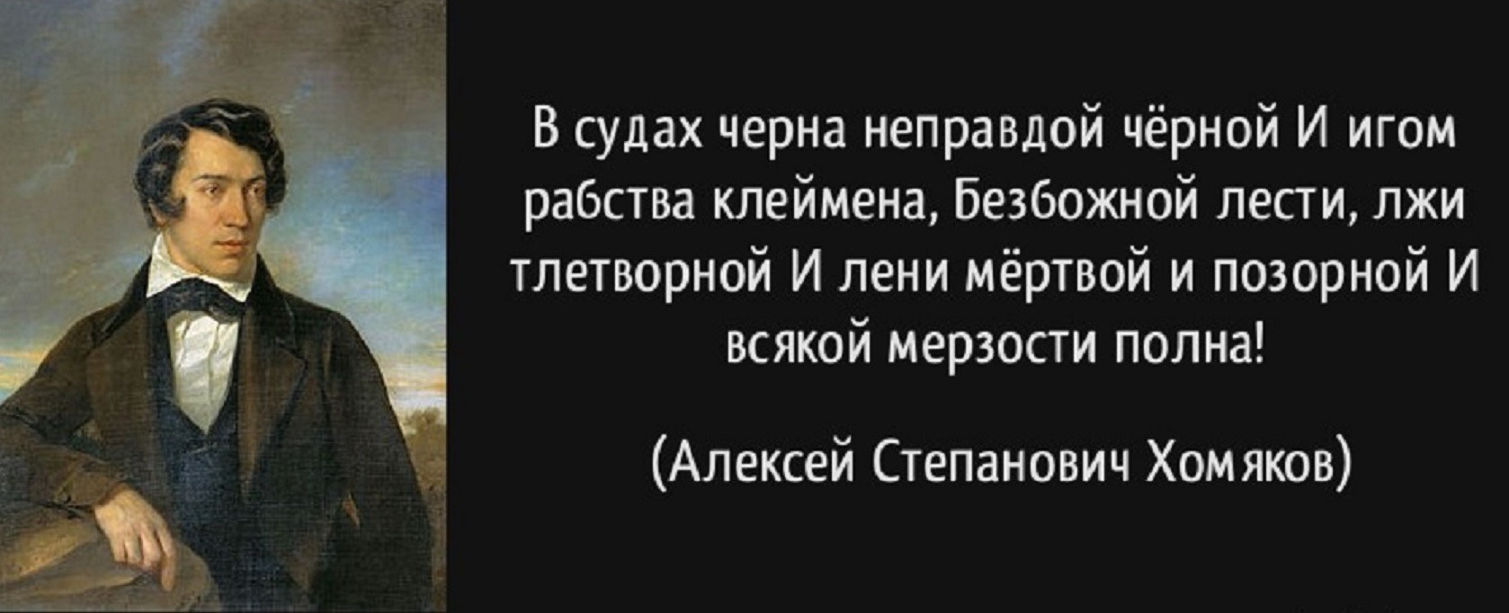 А пока полное разложение в головах и сердцах тех, кто вершит суд над нами, судьях, которые не то, что не воцерковлены, а просто-напросто цинично попирают все мыслимые и немыслимые христианские и земные законы, вынося абсолютно неправосудные судебные решения по итогам возглавляемых ими декоративно-прикладных судебных процессов. Мы же давайте прежде, чем приступим к описанию морально-нравственного разложения сразу нескольких господ в судейских мантиях, присутствующих в одном сфабрикованном уголовном деле, приведем одну цитату из отдания памяти А.С. Хомякову в статье «Рыцарь русского патриотизма», посвященной 150-летию его кончины. Вот те строки об этой яркой во всех отношениях для славянского мира фигуре: «В своей замечательной книге «Церковь одна» он проводит мысль о необходимости воцерковления в деле познания истины, не вмещающейся в ограниченное индивидуальное сознание и присутствующей только в соборном сознании Церкви. России же Хомяков отводил особую миссию: сохранить в своём жизненном укладе начало общинности, которое Запад теряет, погружаясь в индивидуализм». Полностью см. здесь. http://russdom.ru/node/3321