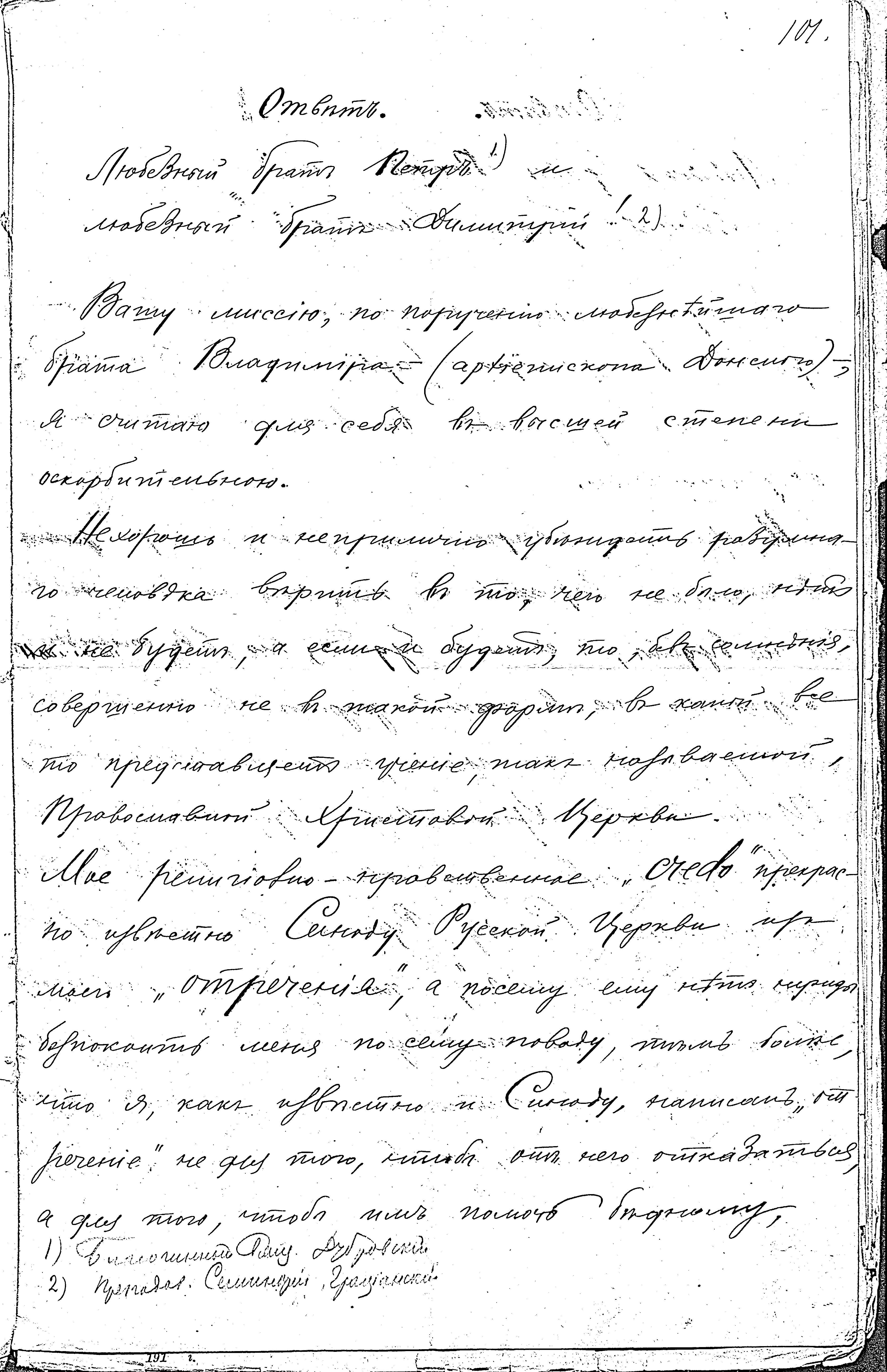 Вашу миссию, по поручению любезнейшего брата Владимира (архиепископа Донского), я считаю для себя в высшей степени оскорбительной.