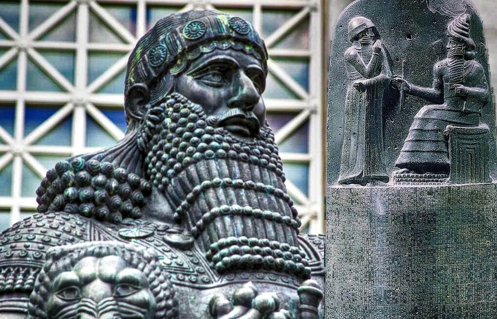 Слева – статуя Хаммурапи. Справа Хаммурапи пред солнечным бог Шамашем (сидит на троне) ‒ рельеф верхней части столба Свода Законов, Лувр