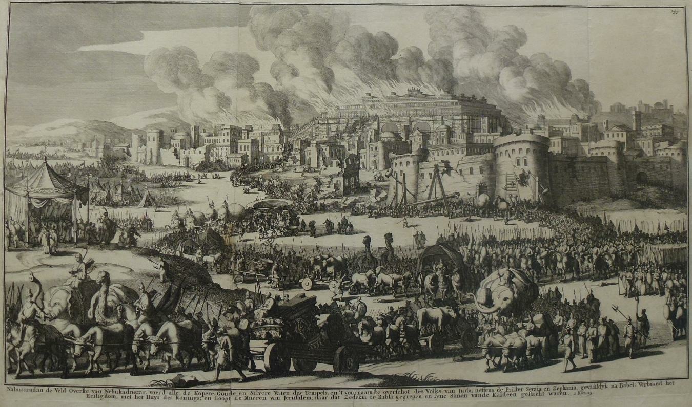 Через месяц после этого, 17 августа 586 гола, в Иерусалим прибыл вавилонский вельможа Набу-зер-иддин, начальник царских телохранителей, с повелением Навуходоносора уничтожить город. Вавилоняне сожгли в Иерусалиме все строения, в том числе дворец и храм, и срыли его стены.