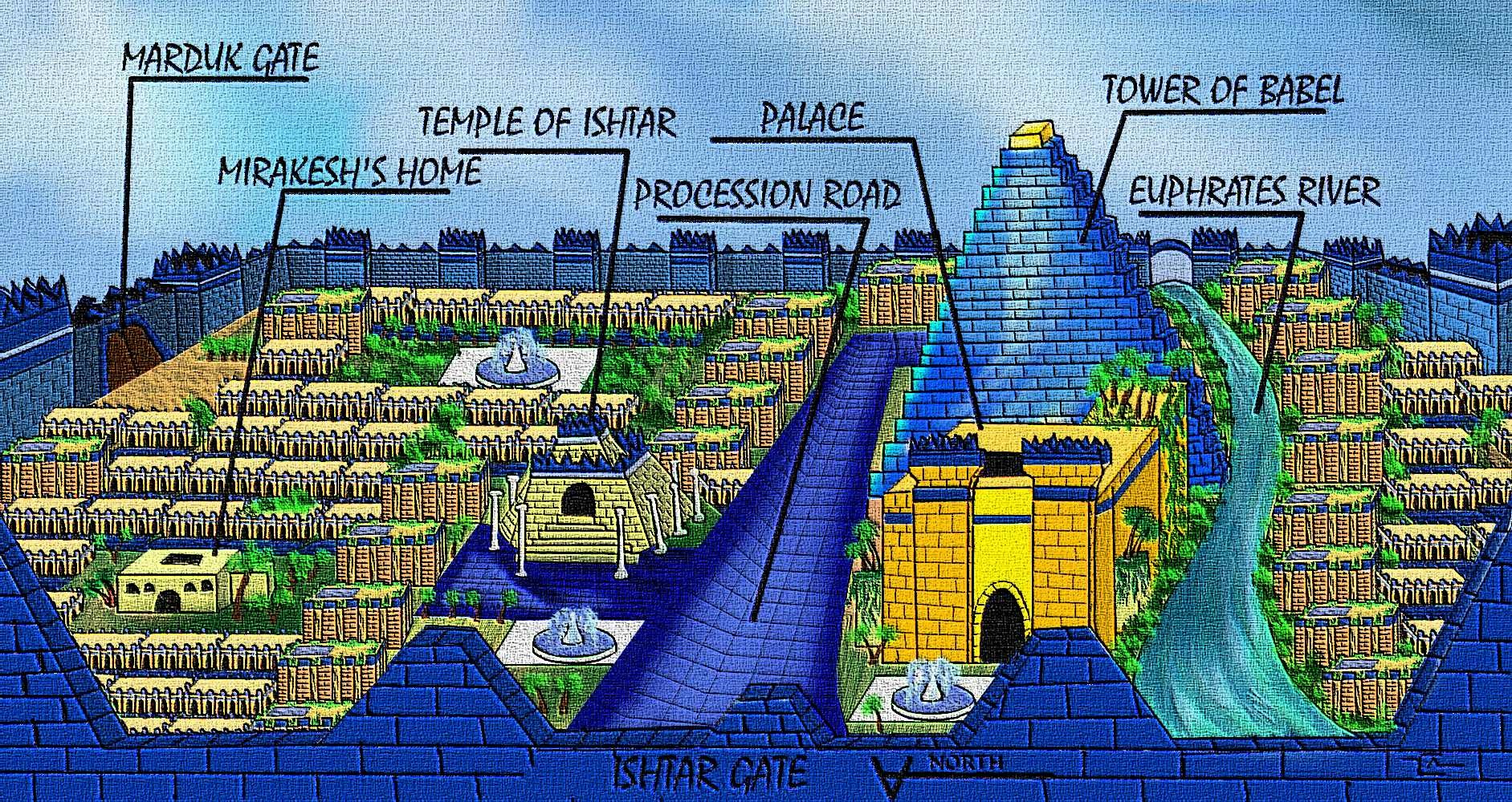 Планировка Вавилона была квадратно-гнездовой. В ее основе лежали восемь широких проспектов, каждый из которых вел к городским воротам. К проспектам примыкали улицы и переулки. Над городом возвышался огромный зиккурат Этеменанки.