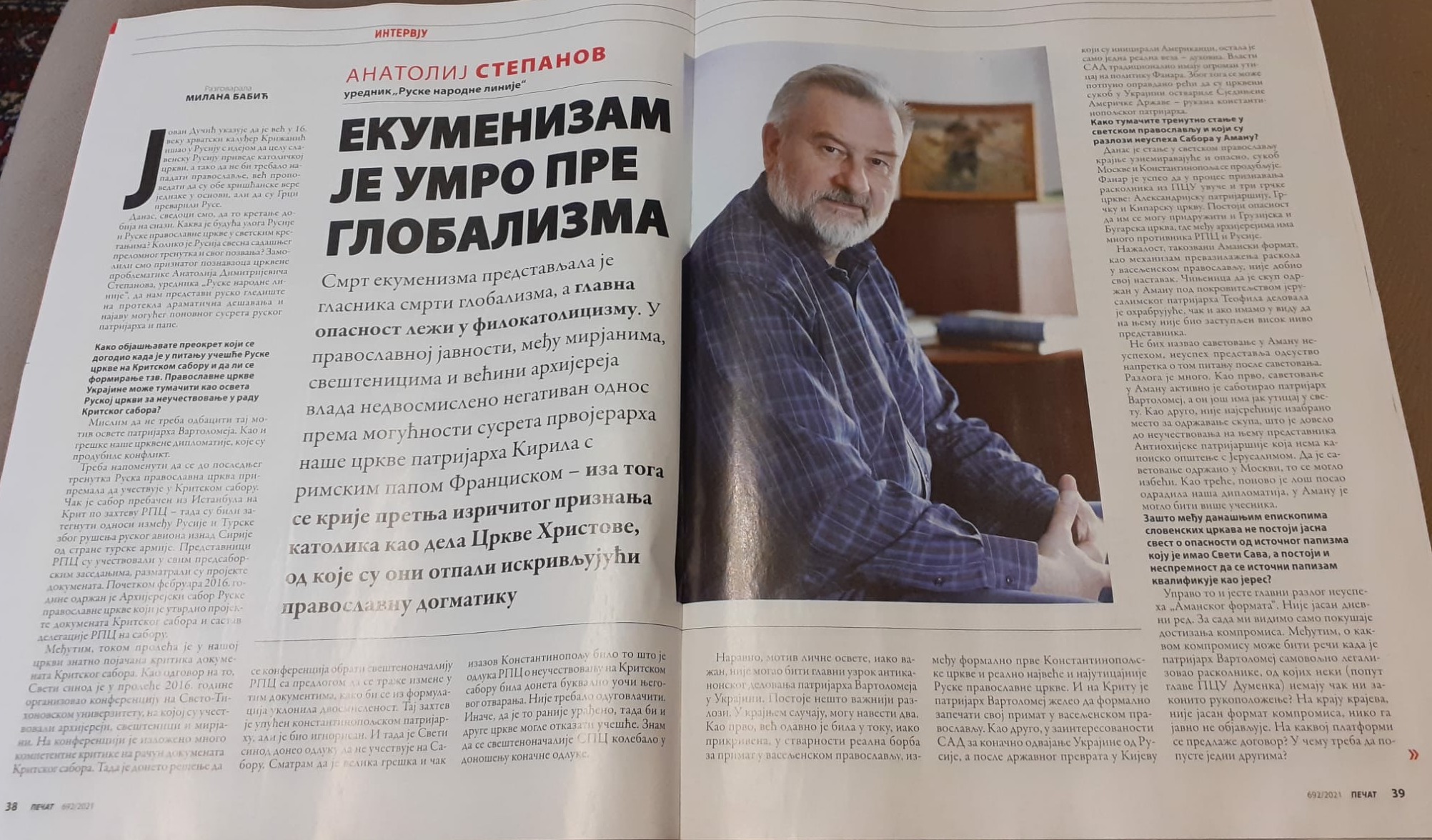 От редакции. В первом номере авторитетного сербского журнала «Печат» вышло интервью с главным редактором «Русской народной линии» Анатолием Степановым, которое подготовила сербская журналистка Милана Бабич. Перевод на сербский язык выполнил постоянный автор РНЛ Ранко Гойкович. В электронной версии журнала оно опубликовано в сокращённом виде. После выхода сербской версии интервью мы можем опубликовать интервью на русском. Полагаем, оно будет интересно и русскому читателю, поскольку касается важных для Мирового Православия и русской истории проблем.