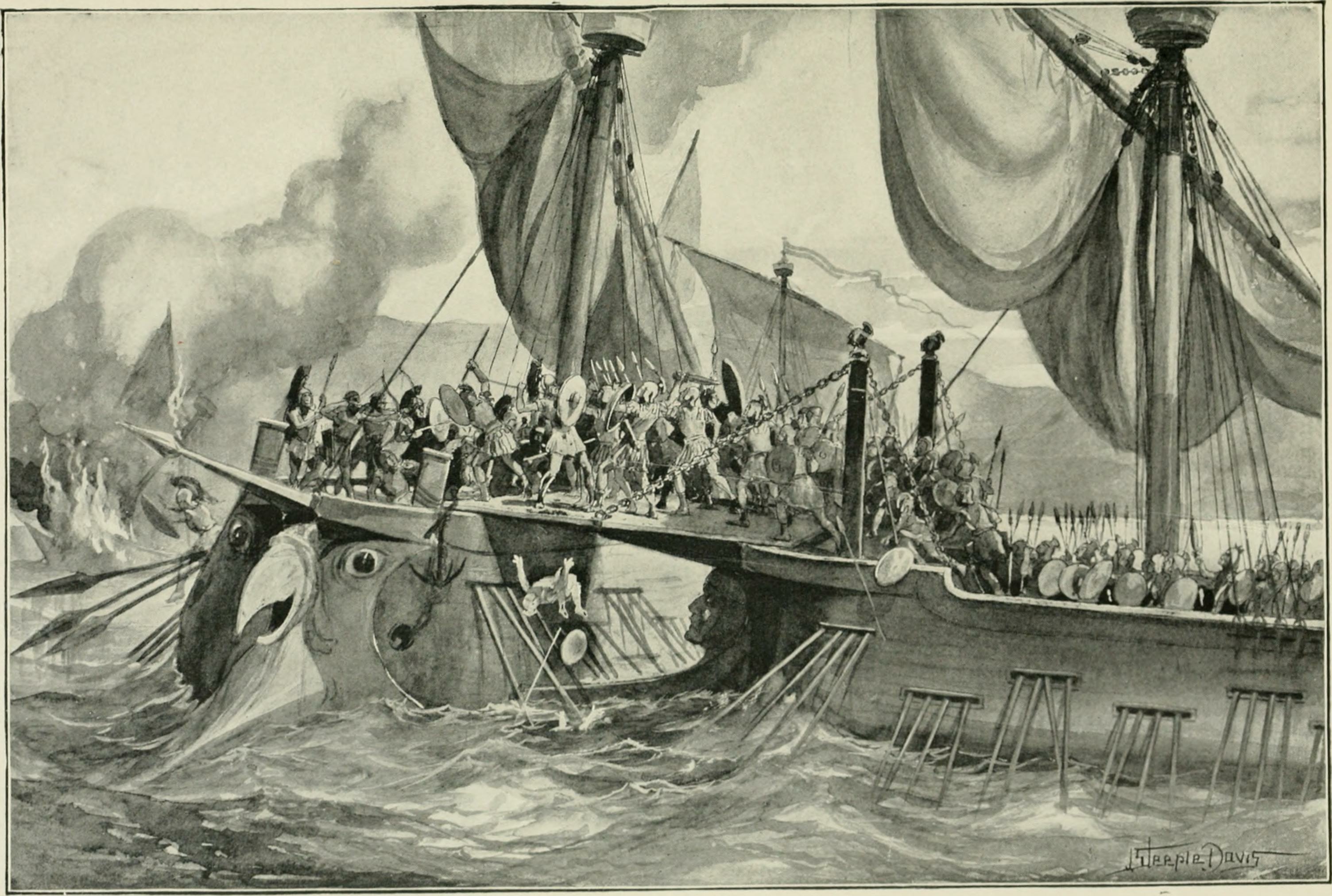Именно римский гений пришел к логичному и неизбежному, но в действительности далеко не очевидному и совсем не простому решению о дополнительной механизации своих судов с целью организации полноценного абордажного боя. [Скажем, цивилизация скандинавов, от древних времен и до конца эпохи викингов, с ее вполне самобытным искусством судостроения, за все столетия не создала специальных приспособлений для облегчения переброски воинов на вражеский корабль. Хотя пользовалась в морских боях исключительно абордажной тактикой].