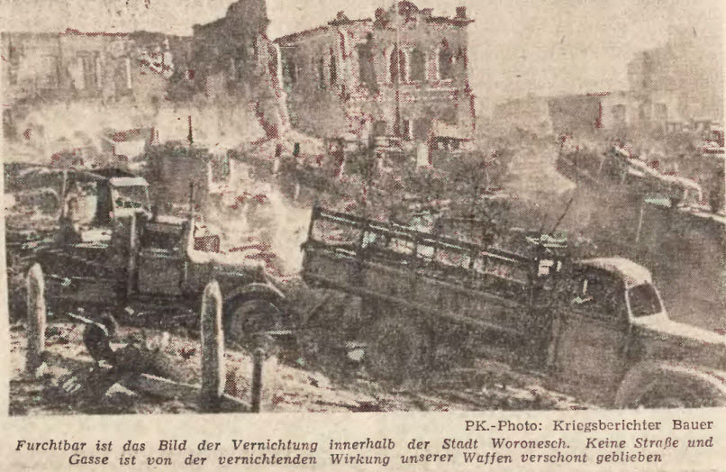 Еще один из самых распространенных мифов фальсификаторов, связанных с Воронежем, это то, что город, стертый в результате 212 дней боев с лица земли, был уничтожен вовсе не немецкой, а Красной Армией. Это ложь. Согласно документам штаба МПВО Воронежа, в июне над городом и его окрестностями побывало 2463 самолета противника, т. е. в среднем по 80 машин в сутки. В первые дни июля гитлеровские летчики совершили на территорию Воронежа 4508 самолето-вылетов. 4 июля около 1200 самолетов, 5 июля – 1500, 6 июля (день, когда немцы ворвались в городскую черту) – до 2000 самолето-вылетов. Воронеж бомбили как ни один город Советского Союза. Это подтверждается множеством фотодокументов, в том числе аэрофотосъемками самих фашистов. 7 июля командующий немецкой группировкой фон Вейхс спешит порадовать фюрера известием, что Воронеж взят. В том же донесении он сообщает, что город полностью разрушен ударами немецкой авиации и артиллерии, и не представляет более из себя материальной ценности. На самом деле такая спешка с донесением была связана с тем, что нужно было как-то оправдаться перед Гитлером за утрату темпа наступления и большие потери, что вызывало в немецкой ставке ярость. Но Вейхс слишком опередил события, город Воронеж так и не был ими полностью взят никогда, а за первую неделю уличных боев при обороне теперь уже своего воронежского плацдарма немцы потеряют столько же солдат, сколько в Битве за Москву. Немецкая пресса в эти дни публикует фотографии руин с теми же помпезными реляциями: «Ужасная картина истребления внутри городской черты. Ни одна улица и переулок не были избавлены от сокрушительного действия нашего оружия». Фашисты и не скрывали, а наоборот, хвалились тем, что они превратили крупный советский город в руины. Еще семь месяцев боев за город, правобережная часть которого превратилась в немецкий плацдарм с девятью линиями обороны в глубину, безусловно, только добавили разрухи. Довершили же уничтожение Воронежа фашисты перед своим позорным бегством, взорвав большинство оставшихся зданий. Но не многим из них удалось уйти от возмездия, их настигли, окружили и по большей части уничтожили в результате начавшейся 25 января с Чижовского плацдарма Воронежско-Касторненской операции.