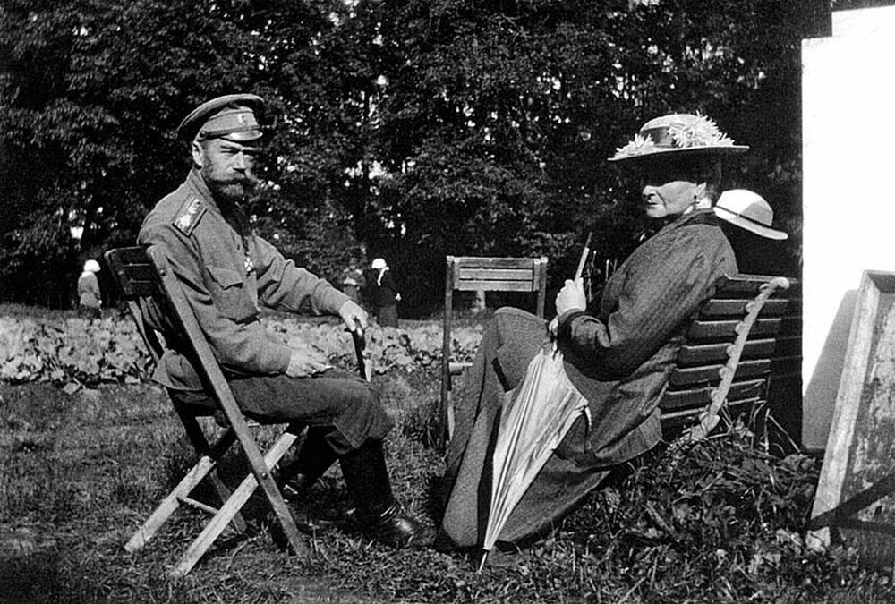 Государь и Государыня в Царском Селе. На заднем плане капустные грядки, устроенные Царской Семьёй на бывших газонах, и фигуры Царских Детей. Середина лета 1917 года
