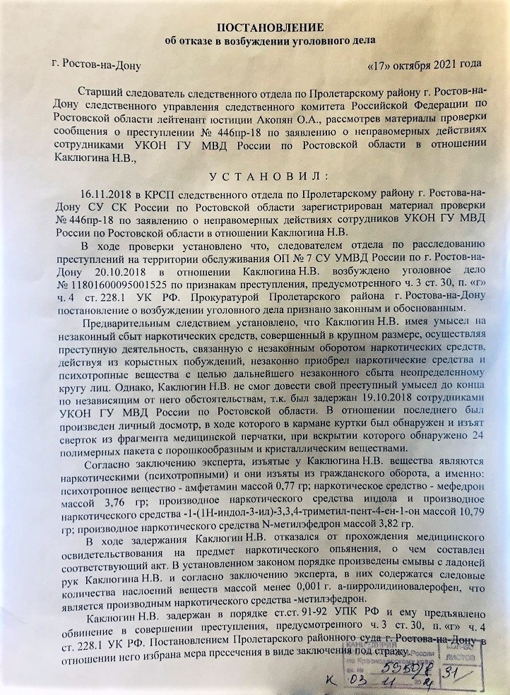 Н.В. Каклюгин: Не едут! А по закону они обязаны были обыски сделать. То есть у меня должны быть весы, как у Голунова https://lenta.ru/brief/2019/06/07/ivan_golunov/ Весы же нашли у Голунова? У меня ни весов, ни чего-либо, связанного с расфасовкой и хранением наркотиков, не было. Но они даже и не искали! Если к Голунову поехали домой, сделали обыск, то у меня даже обыски не проведены. Они пишут: «Потому что это может замедлить скорость следствия». Ну как это?! Здравствуйте! Если статья 228-я, часть четвертая, это, извините, от 10 до 20 лет дается строгого режима, значит, должны быть срезанные карманы куртки, в которой я находился и где был сверток, срезанные ногти [со следами от фасуемых наркотиков]. Этого ничего не сделано. Должны быть допрошены родители, от которых я уезжал в Ростов из Новочеркасска, проведены обыски в их доме, в Краснодаре обязательно должны быть проведены. Этого ничего не сделано. То есть ключевые действия не произведены. Сверток без отпечатков пальцев, без ДНК, стерильный сверток. Они говорят: «Мы, когда нашли сверток этот, мы его развернули, сфотографировали на капоте». Где фотографии этого свертка, как это происходит на капоте машины? Ничего нет https://www.pravmir.ru/proverte-dokazatelstva-pismo-v-zashhitu-nikolaya-kaklyugina-kotorogo-obvinyayut-v-sbyte-narkotikov/