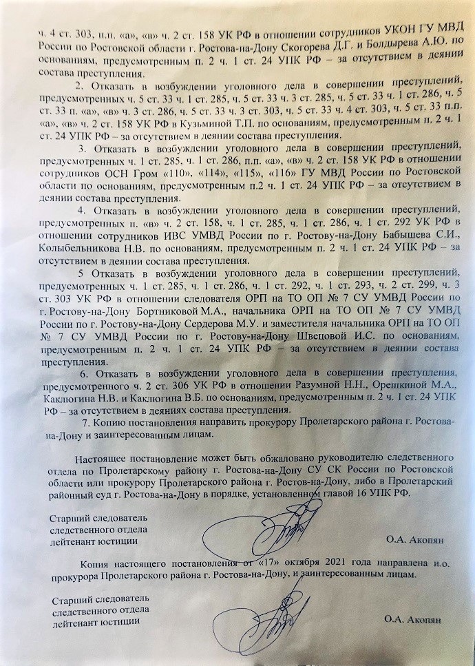 Тем временем из Следственного отдела СУ СК России по Ростовской области по Пролетарскому району г. Ростова-на-Дону лейтенантом юстиции О.А. Акопяном подготовлен и направлен сначала в ИК-11 УФСИН России по Краснодарскому краю, где меня не нашли, поскольку откуда уже вышел неожиданно для нечисти в погонах и без: заказчиков и исполнителей заказа на свободу, а затем по адресу моего проживания в настоящий момент очередной, где-то ориентировочно 13-й (сбились со счету) отказ в возбуждении уголовных дел в отношении всех неоднократно ранее указываемых на судах, в заявлениях и обращениях во всевозможные инстанции, надзорные, следственные, полицейские и правозащитные учреждения и ведомства должностных лиц ГУ МВД России, СУ СК России и прокуратуры Ростовской области.