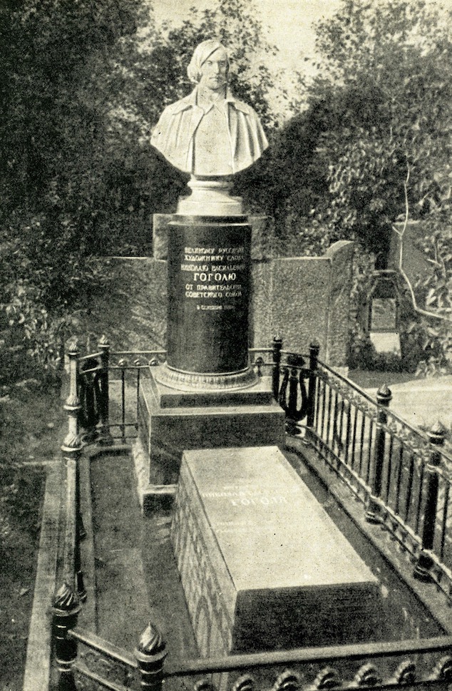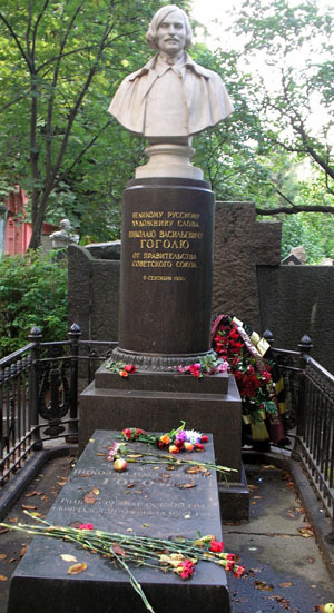 В 1952 году на могиле Гоголя был установлен бюст работы скульптора Николая Васильевича Томского (настоящая фамилия Гришин), на котором выбита надпись: «Великому русскому художнику слова Николаю Васильевичу Гоголю от правительства Советского Союза» (ныне находится в мемориальном музее «Дом Гоголя» в Москве). Это было сделано вопреки завещанию писателя, который просил не ставить ему «никакого памятника и не помышлять о таком пустяке, христианина недостойном. <…> Кто после моей смерти вырастет выше духом, нежели как был при жизни моей, тот покажет, что он, точно, любил меня и был мне другом, и сим только воздвигнет мне памятник»[6]. В 2009 году, когда отмечалось 200-летие со дня рождения Гоголя, на его могиле восстановлен православный крест.