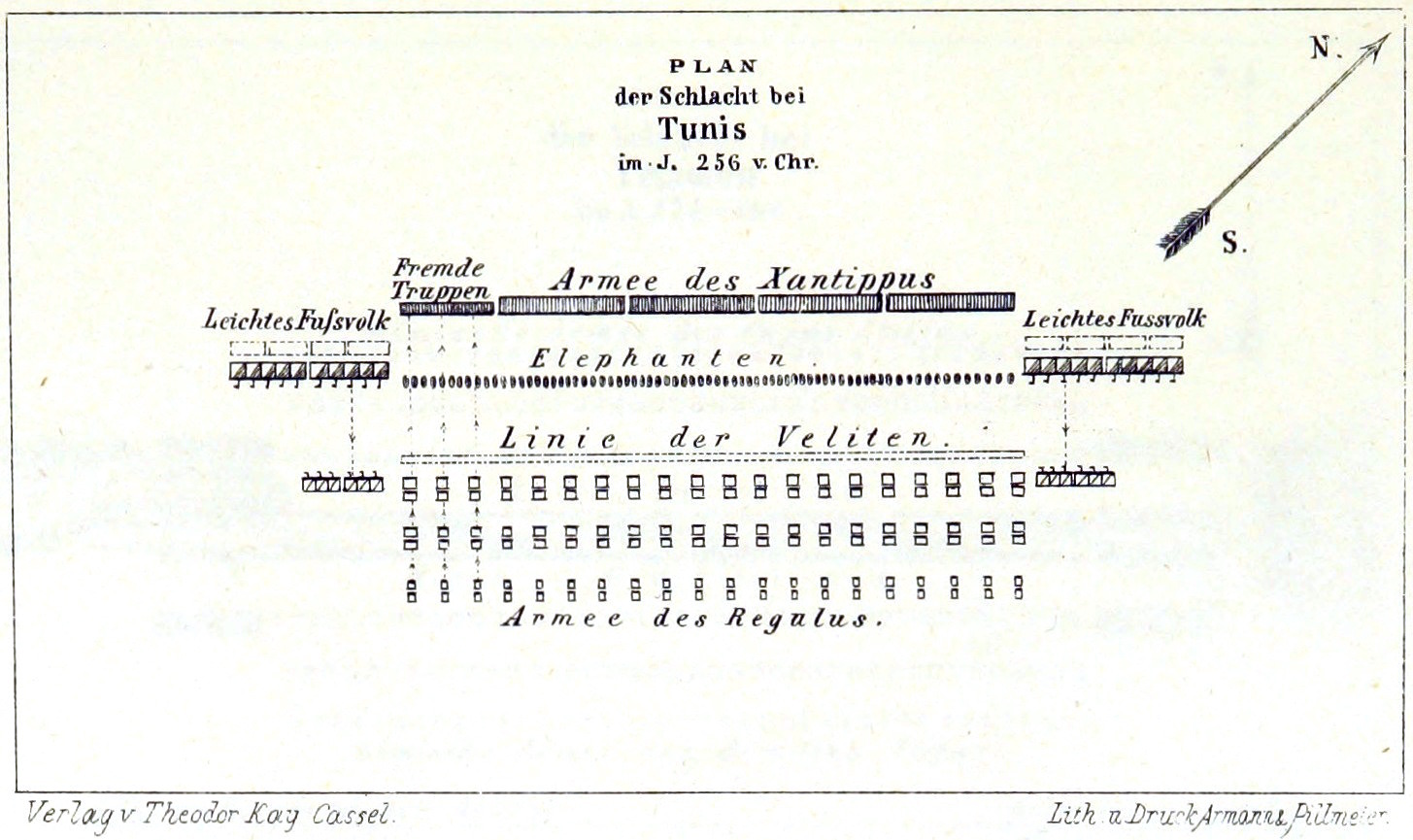 Пока войска Регула преодолевали водную преграду, армия карфагенян вышла из лагеря и построилась к бою»[2].