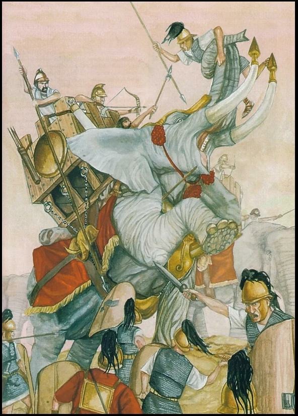 «Передние ряды, которые стояли против слонов, при столкновении с ними были оттиснуты напором зверей, опрокинуты и гибли в борьбе с толпами. Благодаря многочисленности задних рядов, общий строй всего войска оставался некоторое время нерушимым.