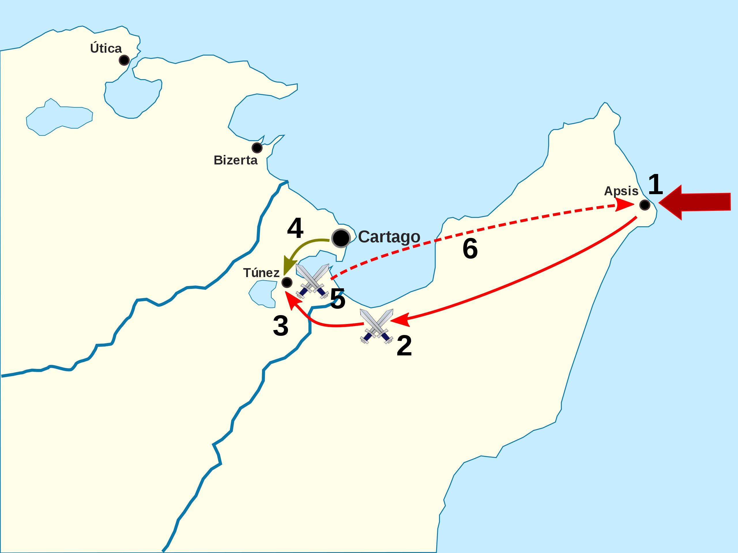1: Римляне высаживаются и захватывают Аспис-Клупею (256 год). 2: Победа римлян при Адисе (256 год). 3: Римляне захватывают Тунис-Тунет (256 год). 4: Ксантипп отправляется из Карфагена с большой армией (255 год). 5: Римляне побеждены в битве при Тунете (255 год).